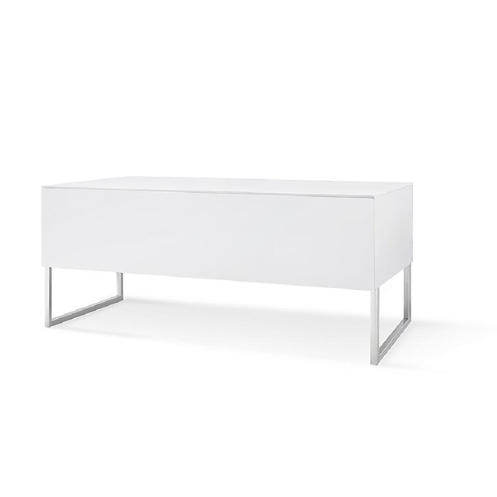 Structure: Lacquered MDF and chromed steel legs. Glass door allowing infrared rays from remote controls to pass through.