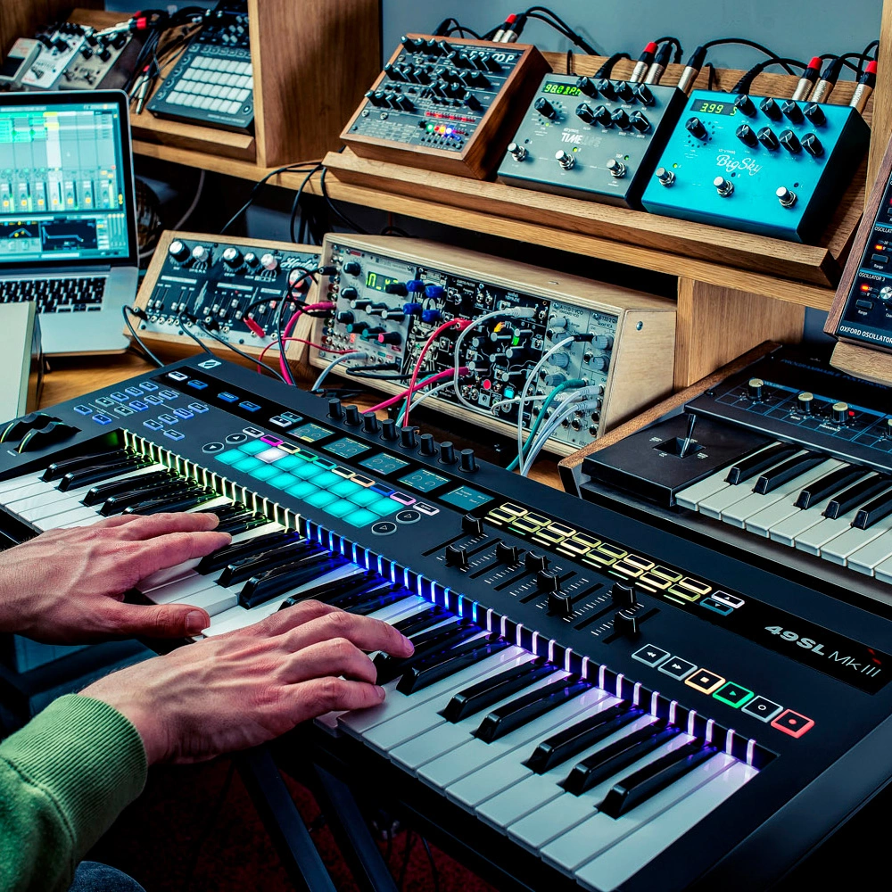 Novation 49 SL MkIII provides complete control over all devices directly from the 8-track polyphonic sequencer, allowing you to connect MIDI equipment and CV/Gate synthesizers, and integrate devices with sound editing applications.