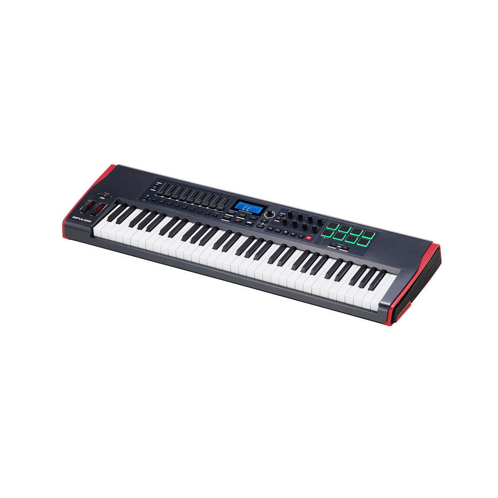 NOVATION IMPULSE 61 is a super-responsive, expressive 61-key MIDI keyboard designed for true musicians, with a clear, fully assignable control interface that integrates perfectly with Ableton Live, Apple Logic Pro, Avid Pro Tools, and other popular audio software. It features a full-size, semi-weighted keyboard with velocity-sensitive keys and inputs for sustain and expression pedals. The High Rate Scan (HRS) technology scans the keyboard 10,000 times per second to accurately capture the smallest nuances of your playing.