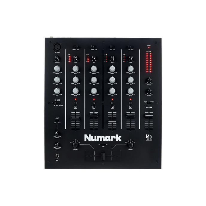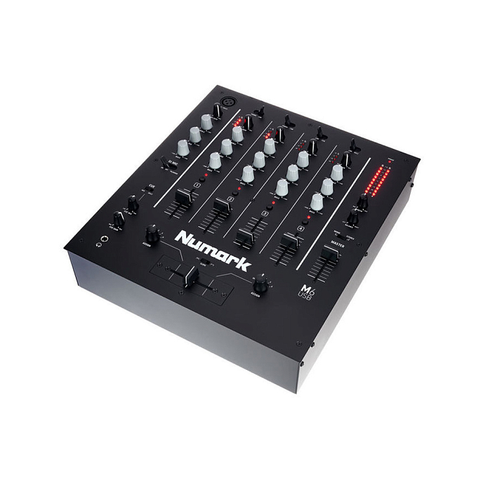 The Numark M6 USB is a high-quality four-channel DJ mixer. It features 4 full-fledged linear channels, plus an additional microphone channel. Each mixer channel is equipped with 3-band equalizers, highly efficient slide faders, sensitivity controls, channel selector toggles, and LED indicators. The console's master bus has a master mix fader and stereo LED indicators for monitoring the output signal.