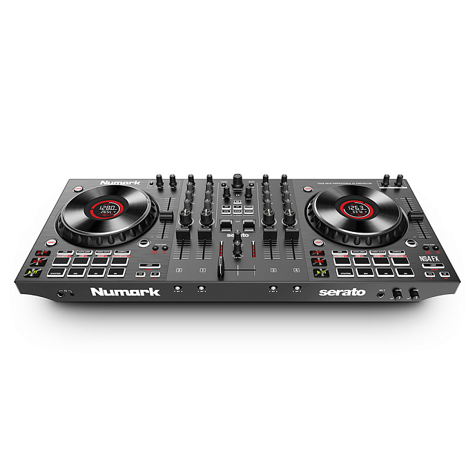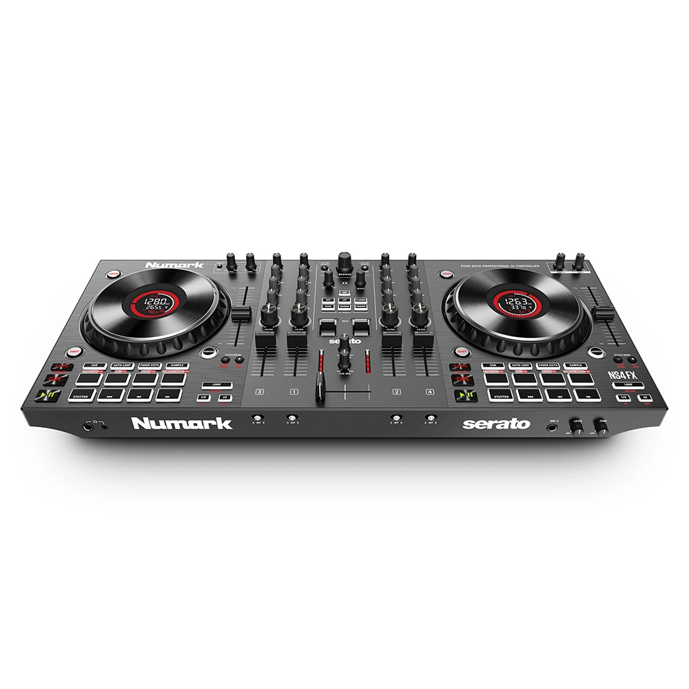 Numark NS4FX - Professional 4-Deck DJ Controller. With full audio control over 4 DJ software decks, toggle FX, and professional inputs and outputs, the NS4FX is a feature-packed 4-channel DJ controller that unleashes the full creative mixing potential of event, club, and livestreaming DJs!