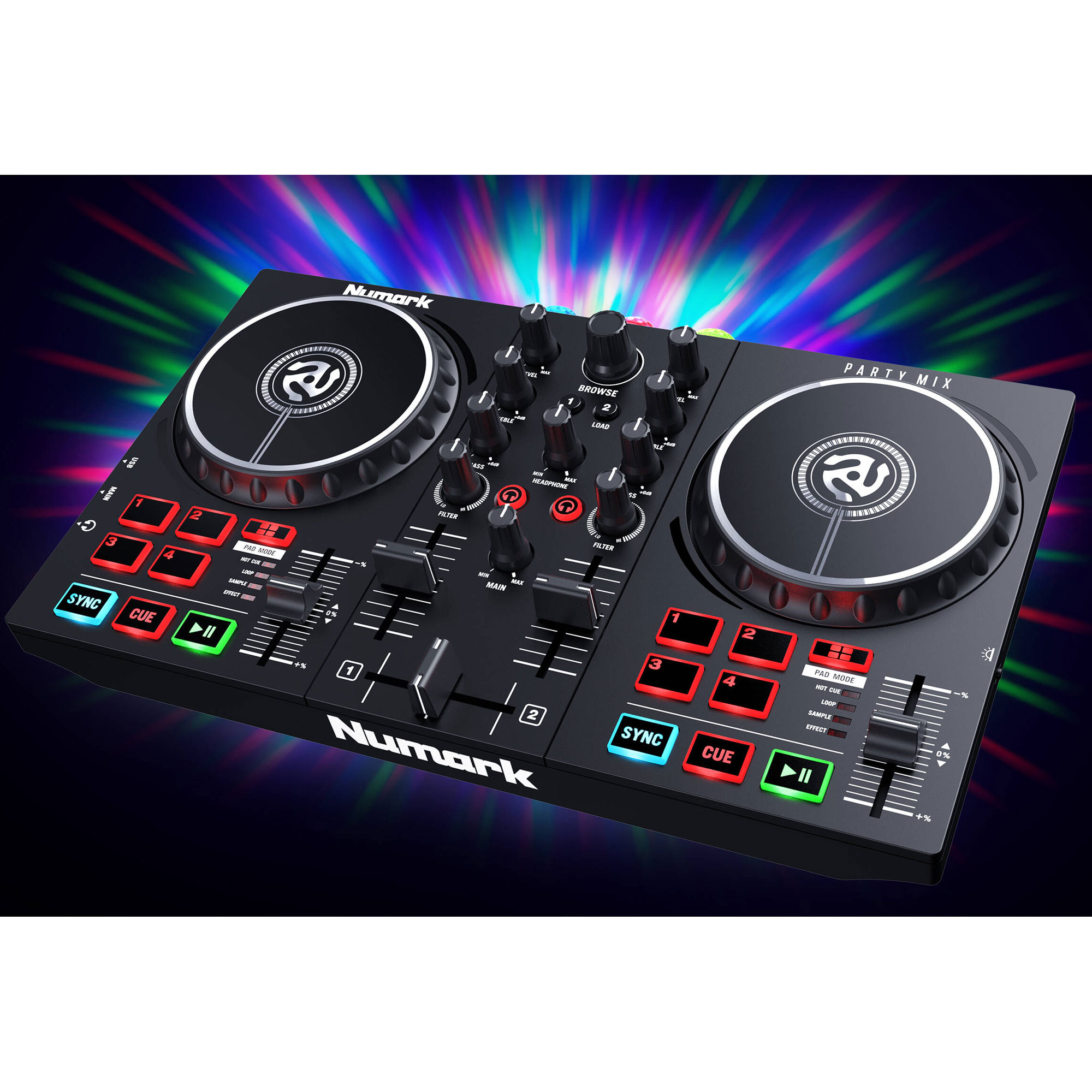 The Numark Party Mix II DJ controller is an updated version of the compact 2-channel Party Mix controller. The second-generation model features three RGB LED lights with a new lighting mode, support for mobile devices and streaming services (TIDAL, Beatport, SoundCloud), as well as several additional functions.
