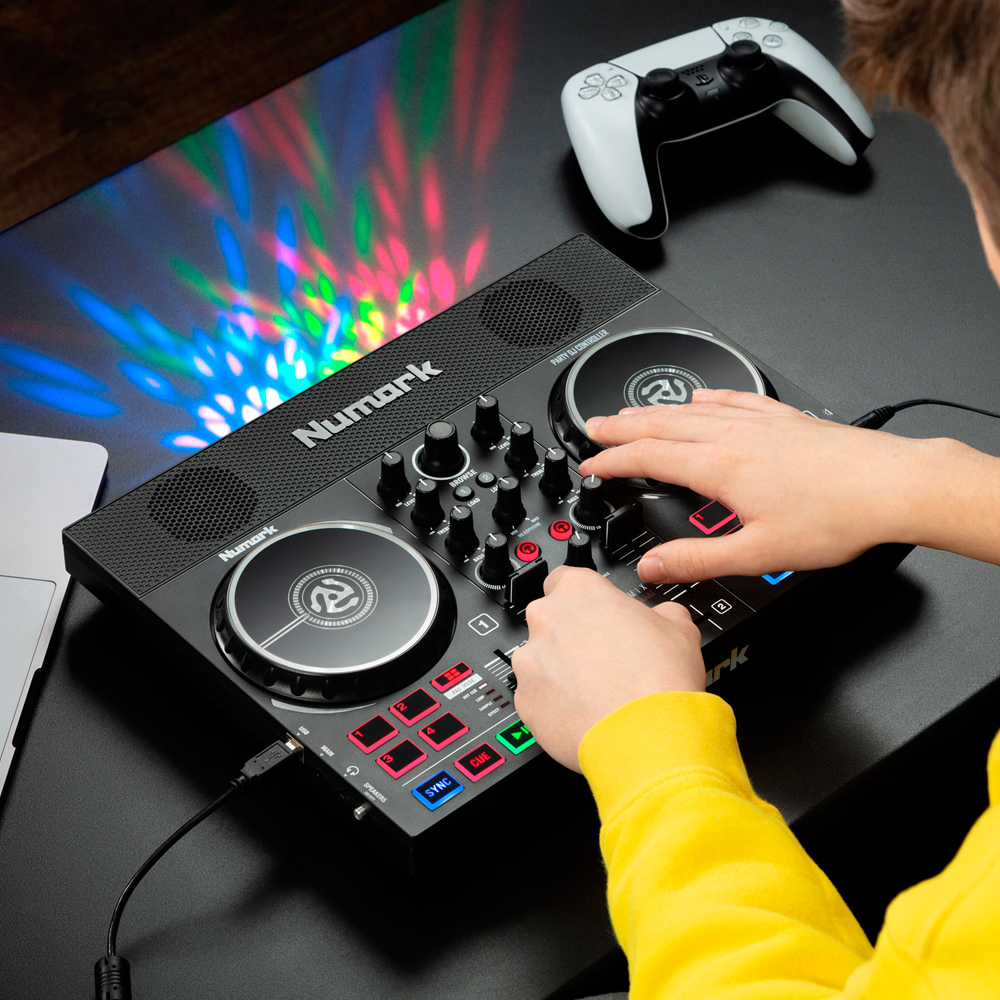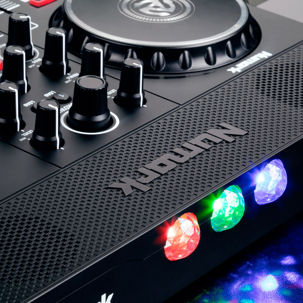 The Numark Party Mix Live is a compact two-channel DJ controller with a built-in sound card, colorful LED lights for a light show, and built-in stereo speakers. The Party Mix Live comes with Serato DJ Lite software, providing access to streaming platforms such as TIDAL, Beatport LINK, Beatsource LINK, and SoundCloud GO. The device is compatible with popular mobile DJ apps for iOS, such as Algorridim's djay PRO AI.