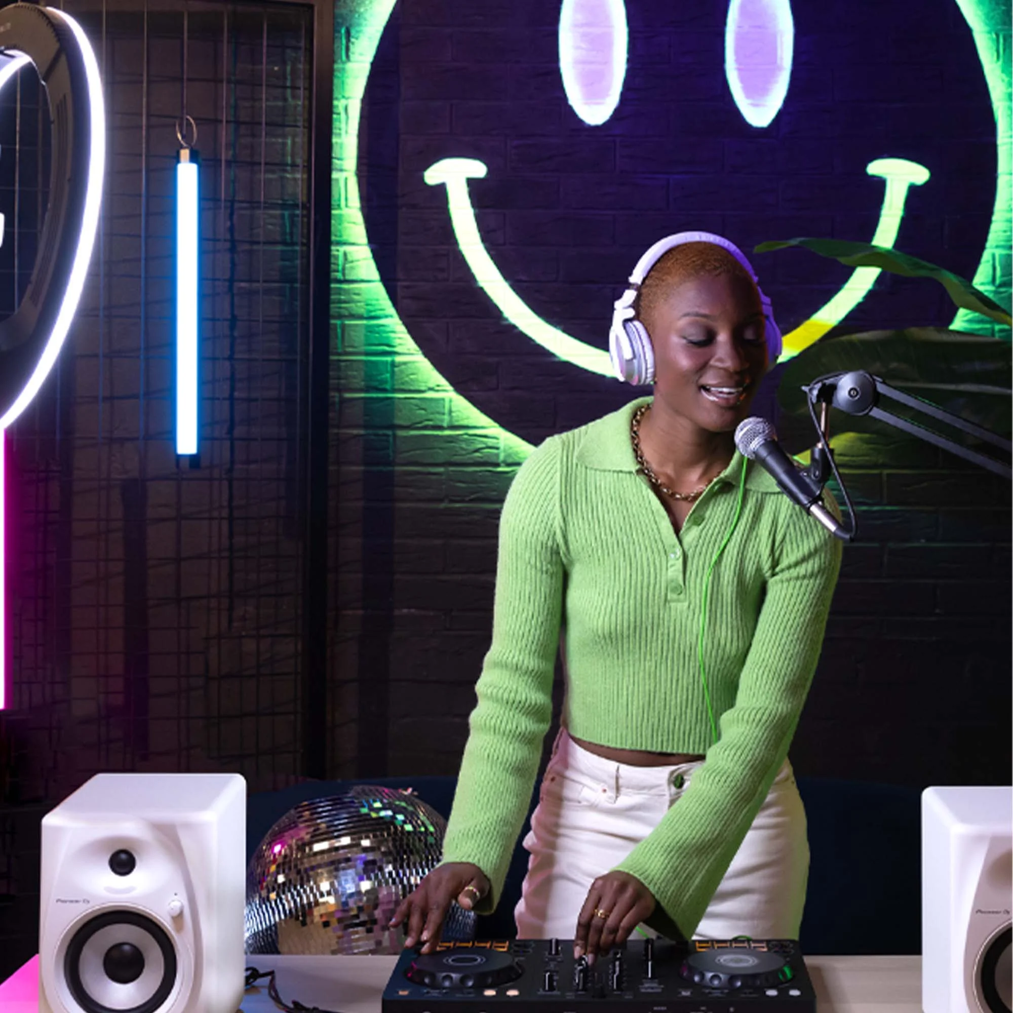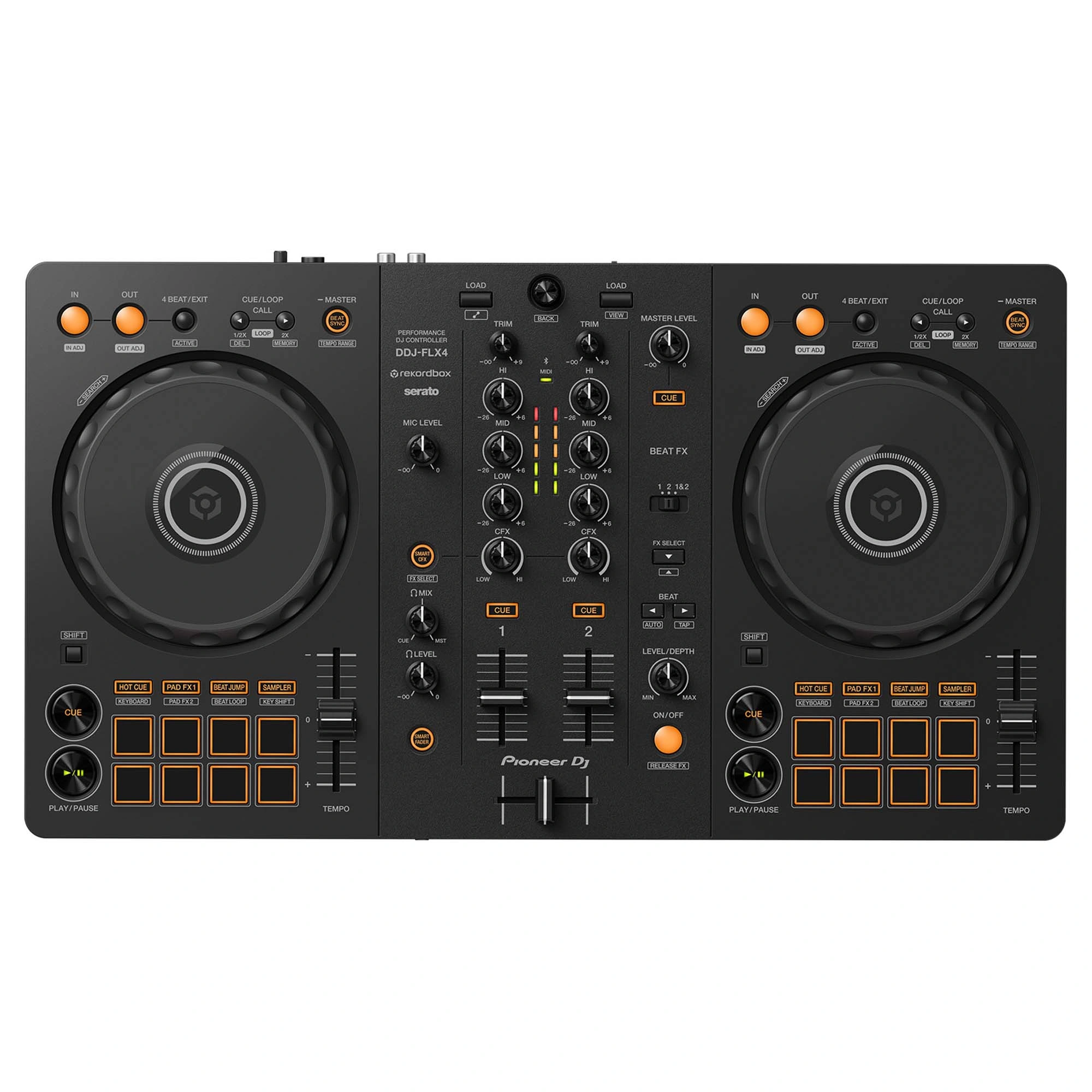 The layout of the control elements on the DDJ-FLX4, inherited from professional Pioneer DJ equipment models, simplifies learning DJing. The simple and ergonomic layout makes the controller compact enough to be easily moved to any place for practice or performances.