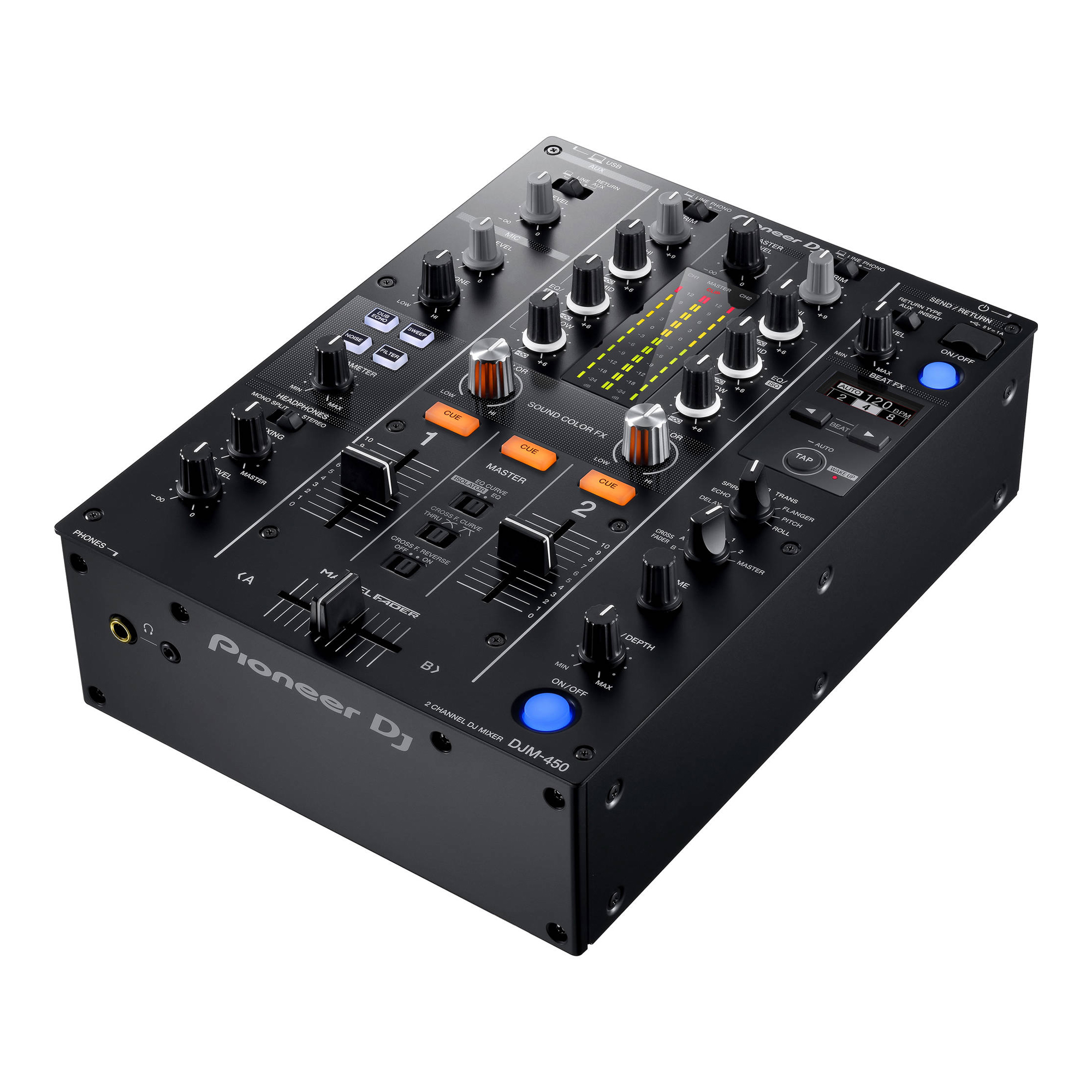 The Pioneer DJM-450 2-Channel DJ Mixer offers professional-level functionality with powerful features from the popular DJM-900NXS2, including the Magvel crossfader, 3-band EQ / Iso, Beat FX, and Sound Color FX. Designed for the professional DJs and turntablists, the DJM-450 features a 64-bit digital signal processor, which provides warm, high-quality audio from both analog and digital sound sources.