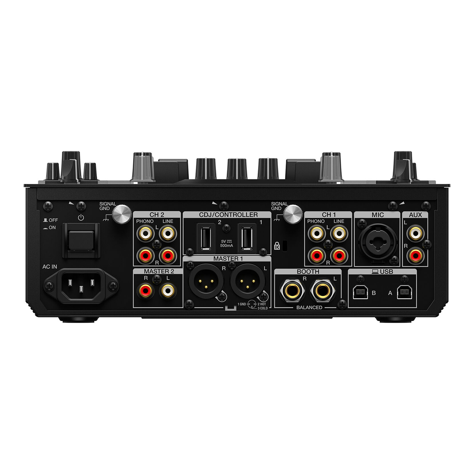 The rear panel sports two stereo RCAs for phono and CD/line per channel, plus a stereo RCA Aux input and a combo XLR-1/4" mic input. For outputs, the mixer includes balanced XLR and unbalanced RCA master outputs, dual 1/4" booth outputs, and two headphone outputs (1/4" and 3.5mm). Additionally, you can connect two computers via dual USB Type-B connectors and two controllers via dual USB Type-A connectors.
