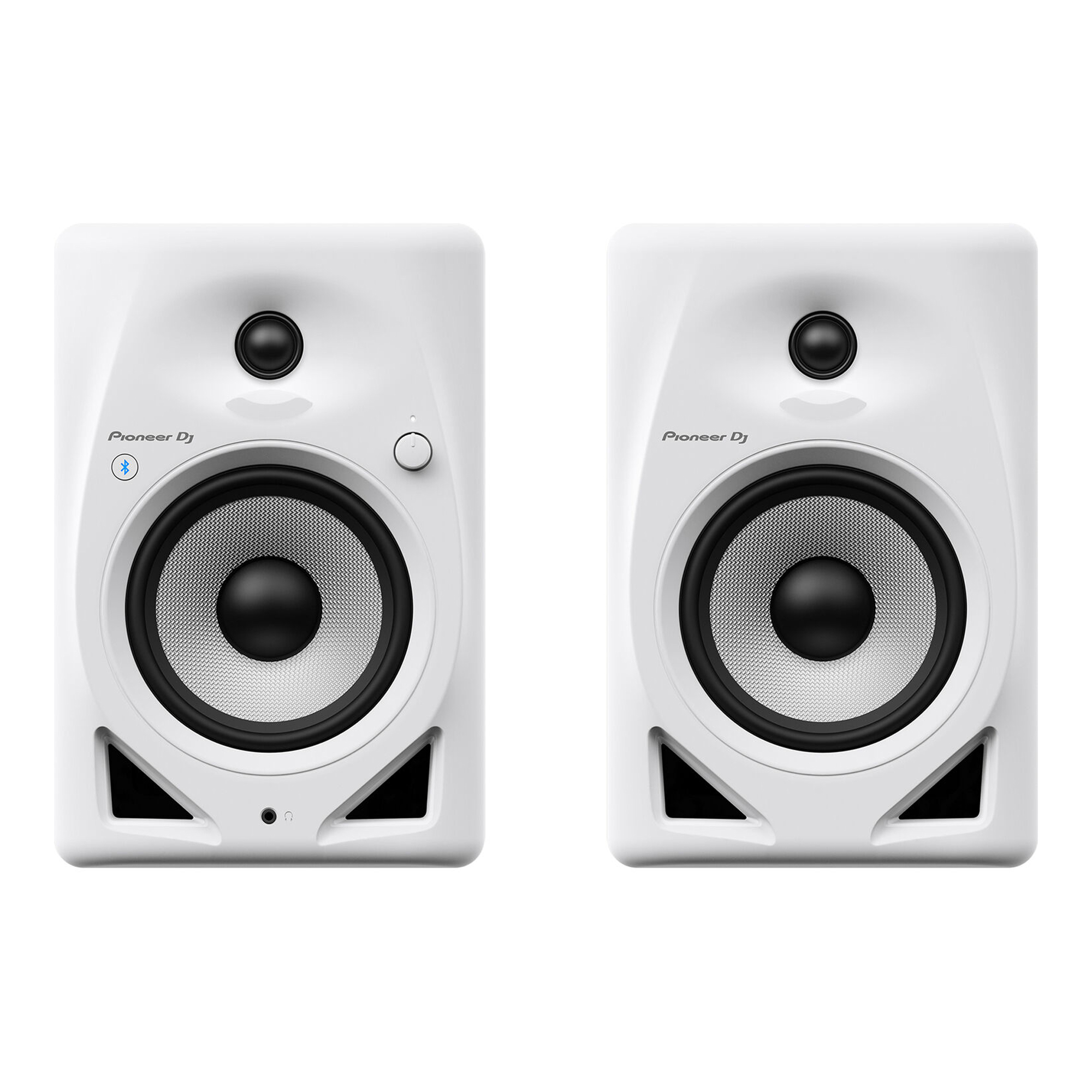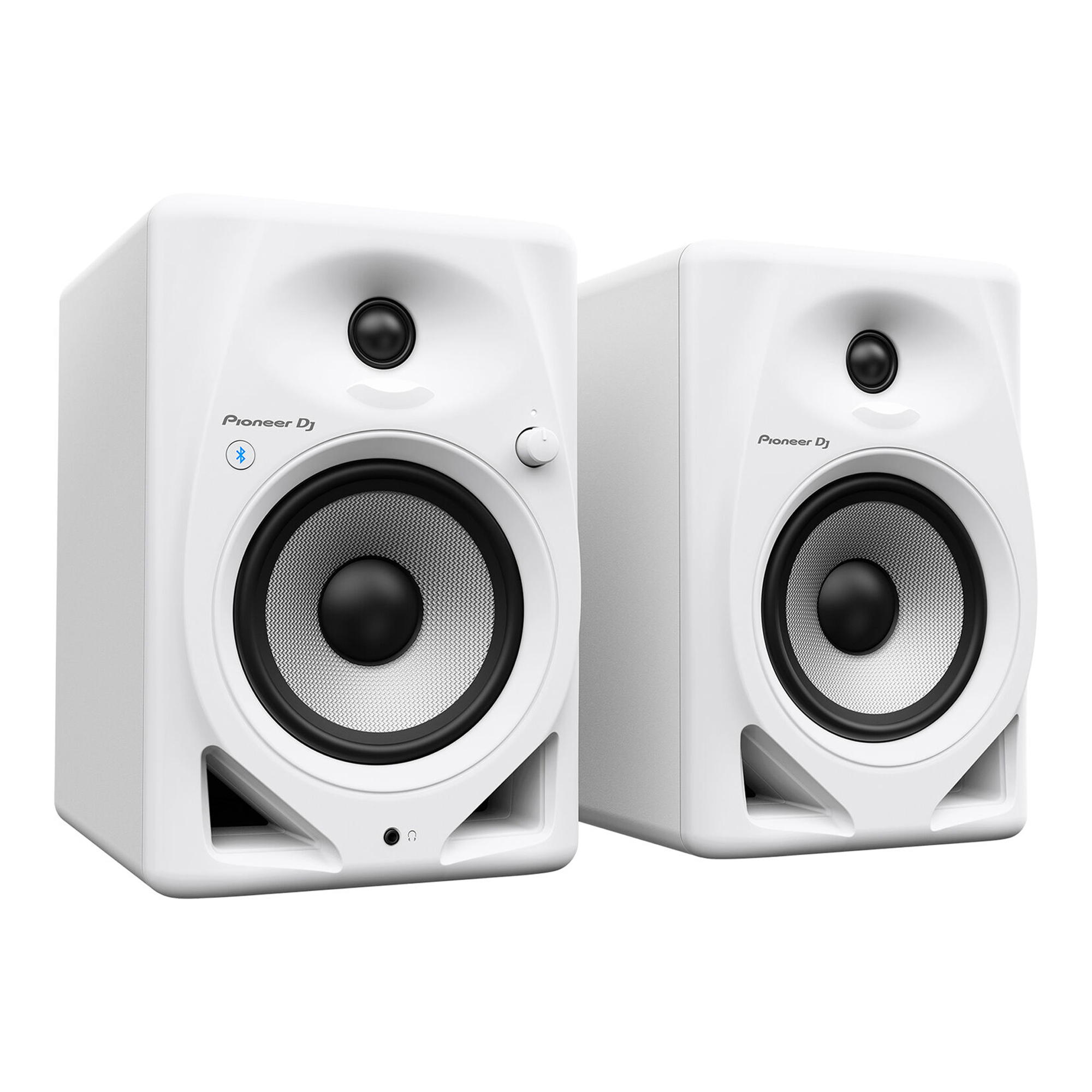 Pioneer DJ DM-50D-BT Active 5" Desktop Monitor/DJ Speakers. DJs looking for a pair of studio speakers will be thrilled with white Pioneer DJ DM-50D-BT, a pair of high-quality studio monitors with DSP that includes a DJ/Production switch, providing two distinct performance articulations for respective applications—all from a single set of speakers. The integrated Bluetooth receiver allows you to stream audio from your smartphone, tablet, or Mac/Windows computer. The Class-D amplifier outputs 2 x 25W of power at 4 ohms. The 5" fiberglass woofers deliver natural and punchy bass, and the 3/4" soft-dome tweeters deliver well-balanced high frequencies. A stereo mini-jack headphone output with a speaker-volume knob are built into the front panel of the speaker. The rear panel features dual 1/4", stereo RCA, and 3.5mm stereo mini-jack inputs, along with an output to the right satellite speaker. In addition, a power cord, a 6.6' speaker cable (for the satellite speaker), a 3.5mm to RCA adapter cable, and bottom cushions are also included.