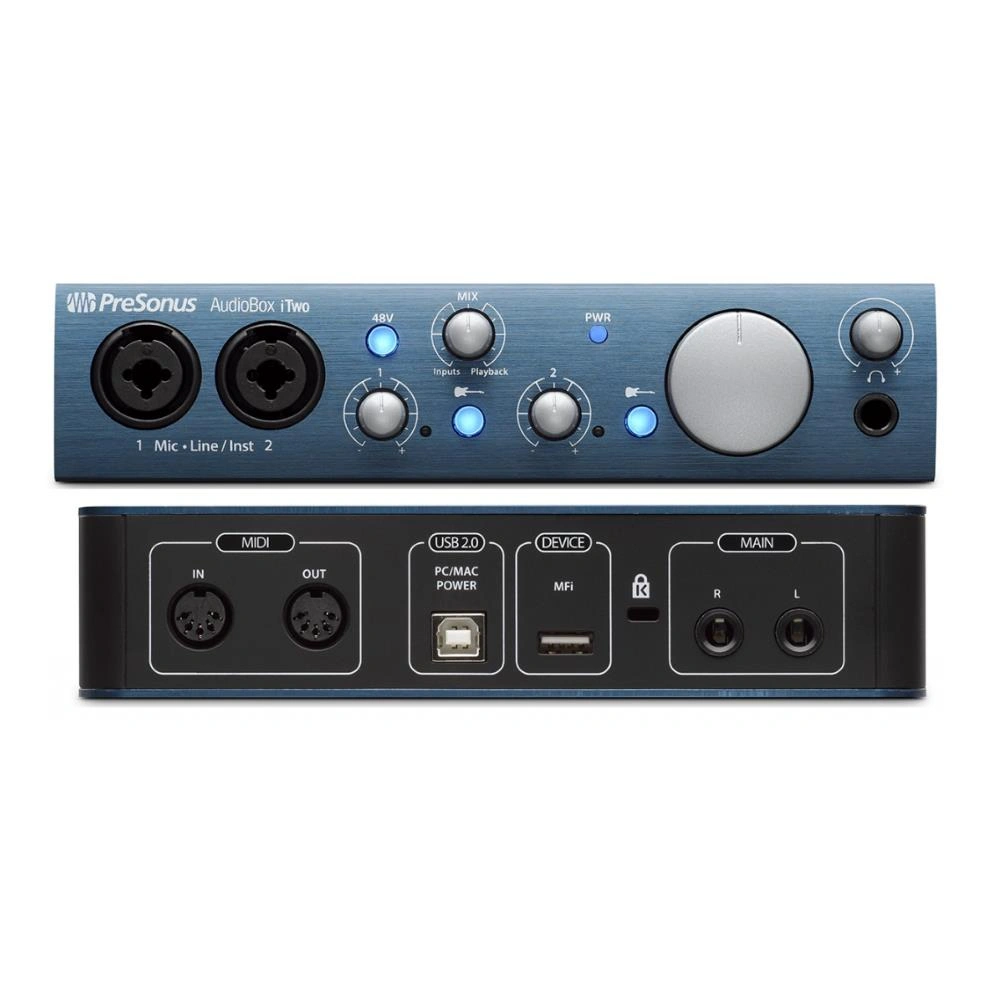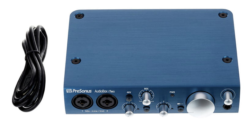 The PreSonus AudioBox iTwo is an external USB audio interface designed for mobile use. Its ADC and DAC work in formats up to 24 bit/96 kHz, it features two combo inputs and two TRS outputs, as well as MIDI in/out and a 1/4" Jack headphones output.