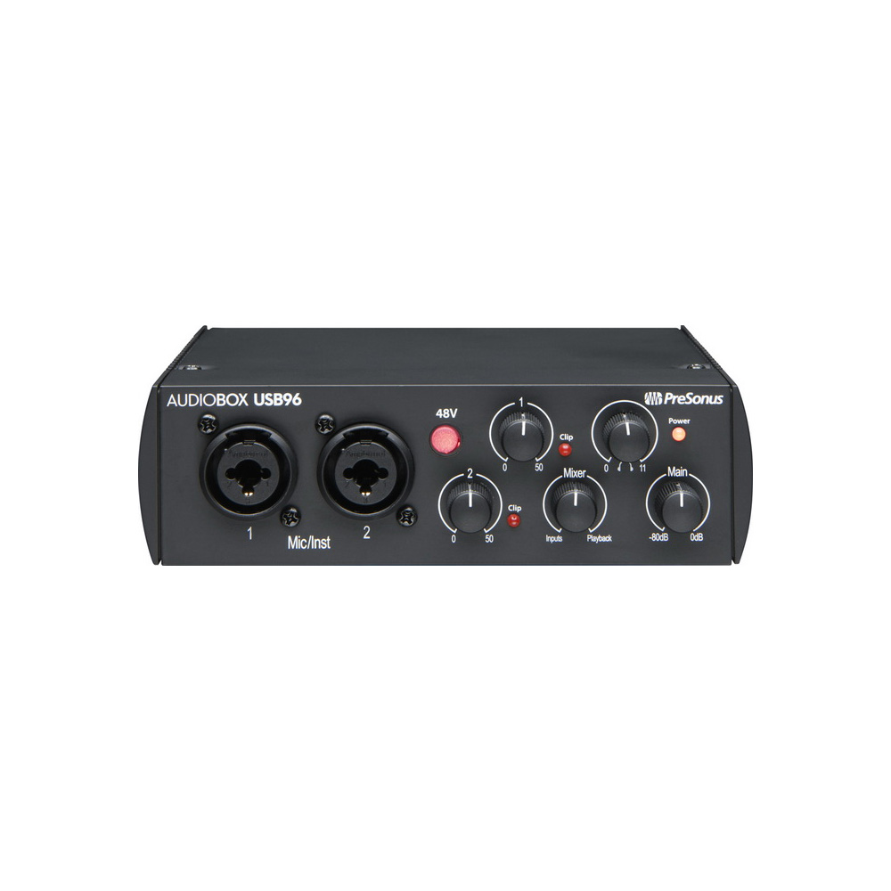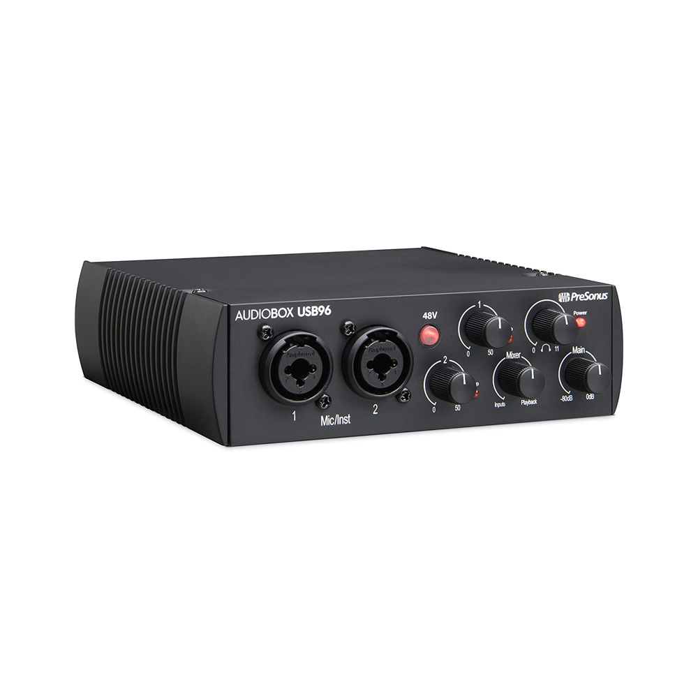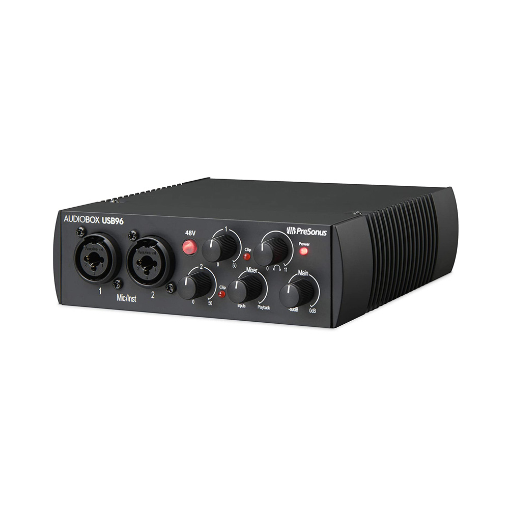 The PreSonus AudioBox USB 96 is an entry-level external USB audio interface with high-quality A/D/A converters with a dynamic range of 104 dB, Class A microphone preamps, and minimal latency. The device is perfect for mobile recording due to its durable all-metal housing and USB bus power.