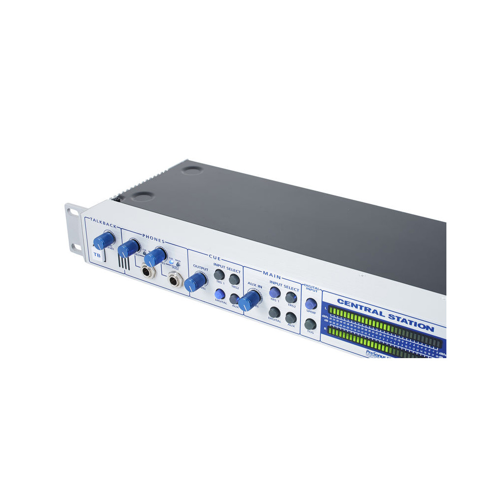 The Presonus Central Station Plus studio controller is one of the most popular controllers for professional studios today. It combines stereo inputs/outputs with excellent recording/communication functions, allowing you to utilize various audio sources and monitor systems. The Central Station Plus offers 2 stereo analog inputs with individual level control and connects 2 S/PDIF stereo sources via coaxial and optical inputs. You can monitor these sources using 3 pairs of different monitors with separate level adjustments for each.