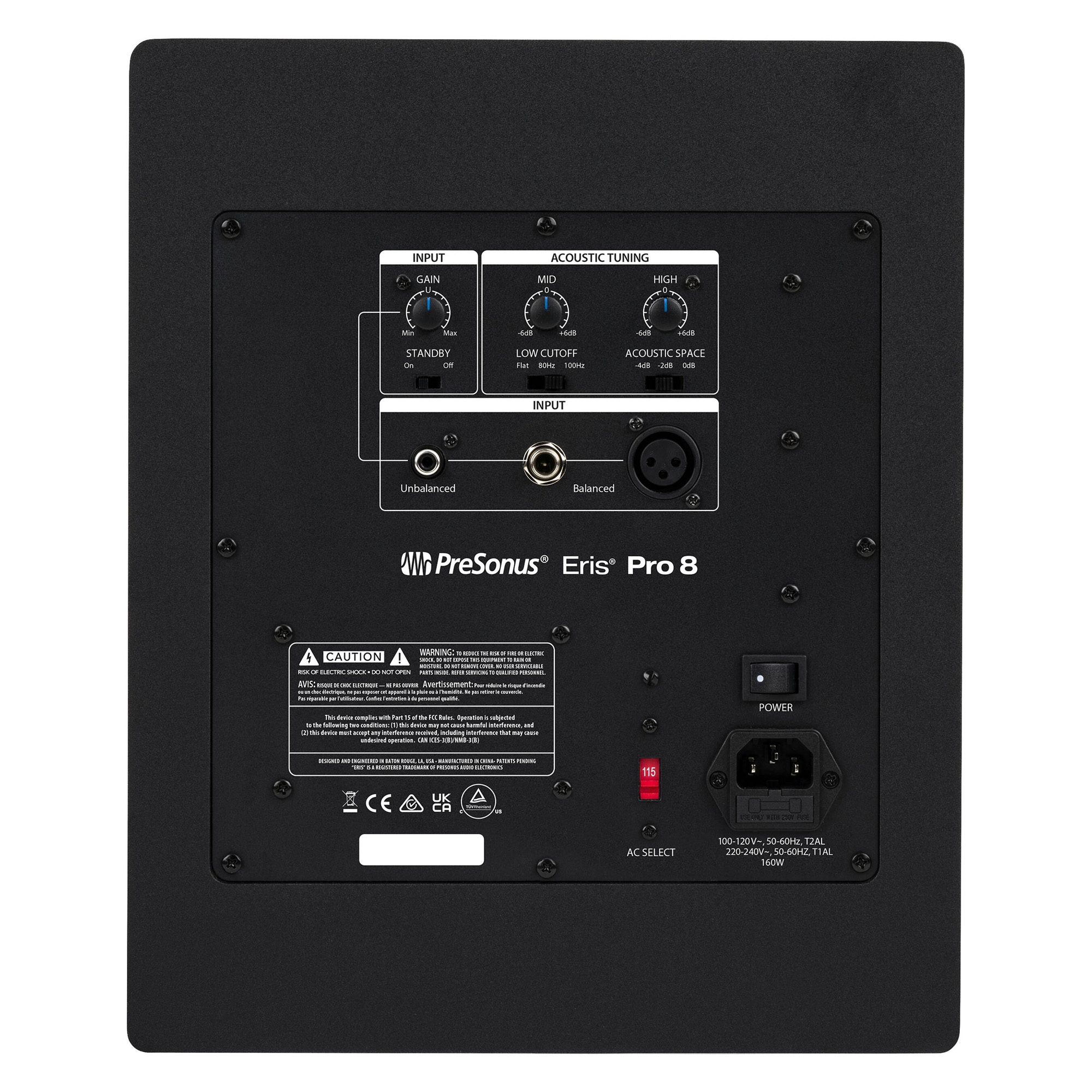 The PreSonus Eris Pro 8 is an 8" 2-way active studio monitor. It features a coaxial design with a single point source for clear and accurate sound reproduction. This design provides excellent phase alignment between components, ensuring precise stereo imaging and a symmetric dispersion pattern.
