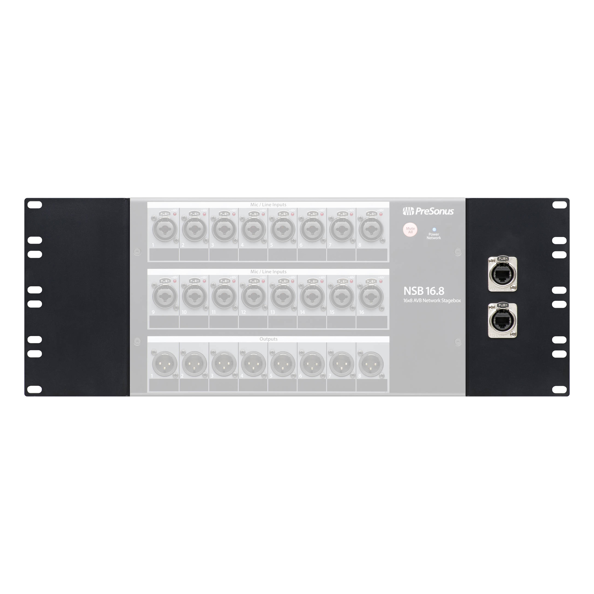 The PreSonus NSB 16.8 Rackmount Kit allows you to install your NSB 16.8 AVB network stagebox into a standard 19" rack mount enclosure. The kit includes two blank panels, two Ethernet cables, and mounting screws. One panel features two Ethercon jacks, which once connected with the included Ethernet cables, provides access to the AVB network ports from the front panel.