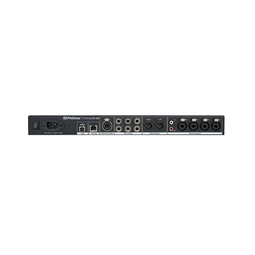- Inputs: 16 x Combo Jack/XLR mic/line in (ch 1-16), 2 x RCA unbalanced in (ch 15-16), 1 x RJ45, 1 x USB A;