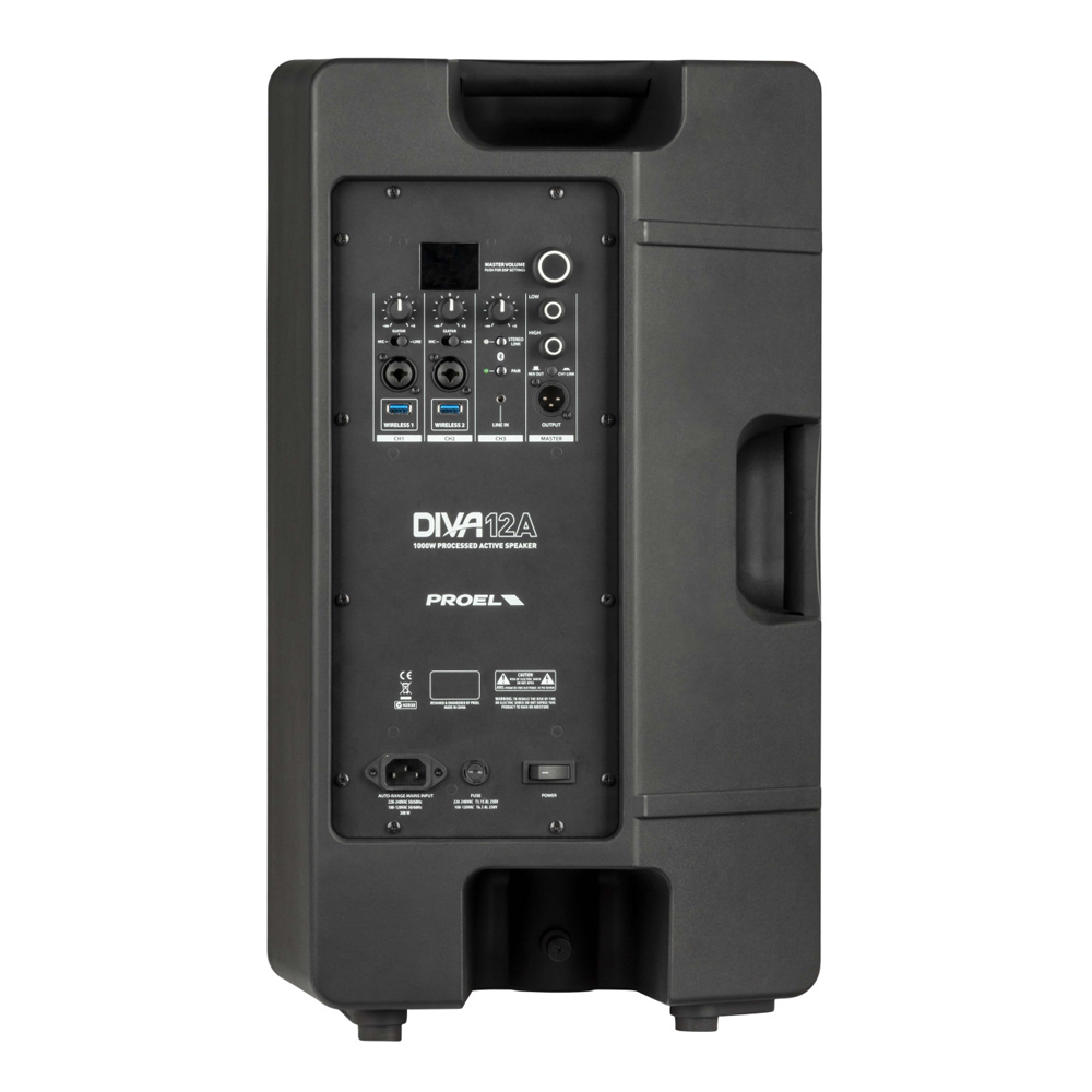 The sophisticated pre-amp section includes an advanced processing with high-performance DSP engine and linear phase FIR filters, for a very smooth response and high-definition sound. An intuitive user’s interface with LCD color display and single-knob control is available for a quick selection and display of the 5 available EQ presets (MUSIC, LIVE, DJ, MONITOR, SPEECH), allowing the speakers to be perfectly adapted to any kind of application. Thanks to the built-in 3-channel mixer with MIC/GUITAR/LINE input selection, HIGH and LOW EQ controls and two WIRELESS USB inputs for the use of PROEL U24 microphone systems, the DIVA12A and DIVA15A can be used in a variety of applications also without external equipment.
