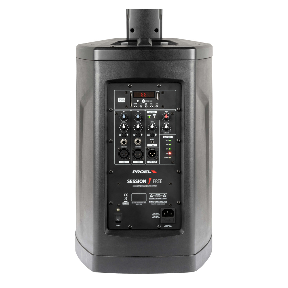 Proel SESSION 1 FREE Battery Powered Portable Column Speaker System. SESSION1FREE can be used in a variety of applications, ranging from speech diffusion and music playback to live music and DJ sets.