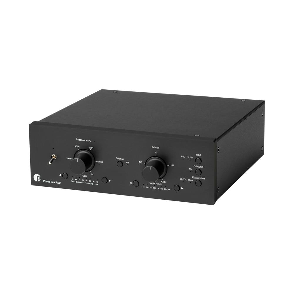 The Pro-Ject Phono Box RS2 is the second generation flagship phono preamplifier. This model features a fully balanced circuit design with discrete components and passive equalization for both RIAA and DECCA curves for both moving magnet (MM) and moving coil (MC) cartridges, which can be connected in either balanced or unbalanced configuration using XLR or RCA connectors.