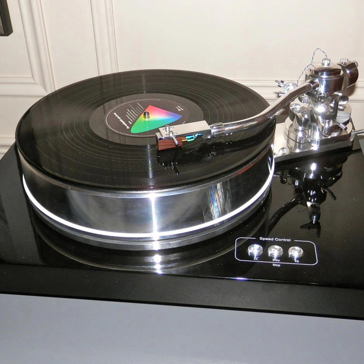 The top surface of the turntable is covered with a thermo-elastoplastic coating, preventing the record from slipping. Additionally, it comes with a special press to further secure the record in place. The belt drive pulley ensures smooth rotation of the record, while the Flywheel system eliminates vibrations from the motors. The built-in speed control allows easy switching between 33 1/3 RPM and 45 RPM with the press of a button.