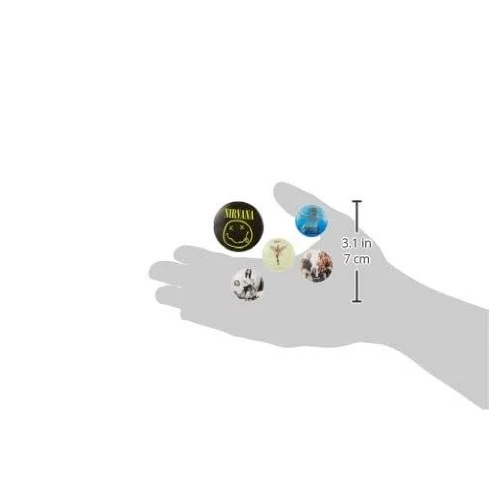 Experience a piece of grunge history with the Nirvana Pack 5 Badges - the official Pyramid Nirvana (Iconic) Pin Badge Pack that every true fan needs. This thoughtfully curated set includes five high‑quality enamel pin badges, four featuring classic 25 mm Nirvana‑inspired designs and one bold 38 mm piece capturing the band’s instantly recognizable visuals, all officially licensed and crafted by Pyramid International to celebrate the legacy of one of rock’s most influential bands. Lightweight and easy to attach, these badges are perfect for personalizing your denim, backpacks, caps, concert gear, or collector displays, making them a fantastic gift or keepsake for anyone who loves the raw sound and rebellious spirit of ‘90s grunge culture.