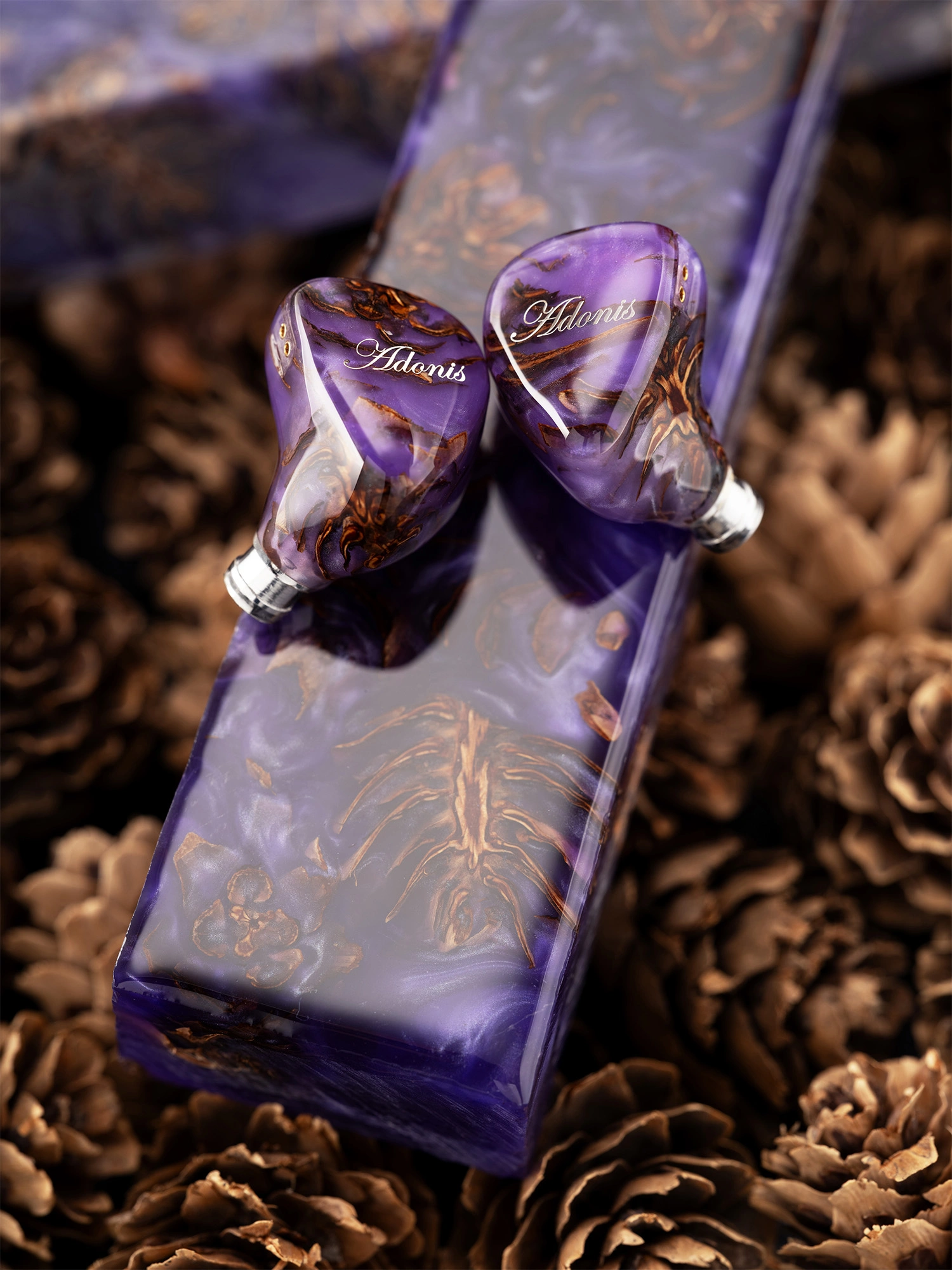 In Adonis New, a combination of pine cones and birch bark resin from the previous generation is used, which preserves the natural shape of the pine cone, is poured with resin, and cut out of a solid piece with a CNC machine, resulting in various textures and patterns.