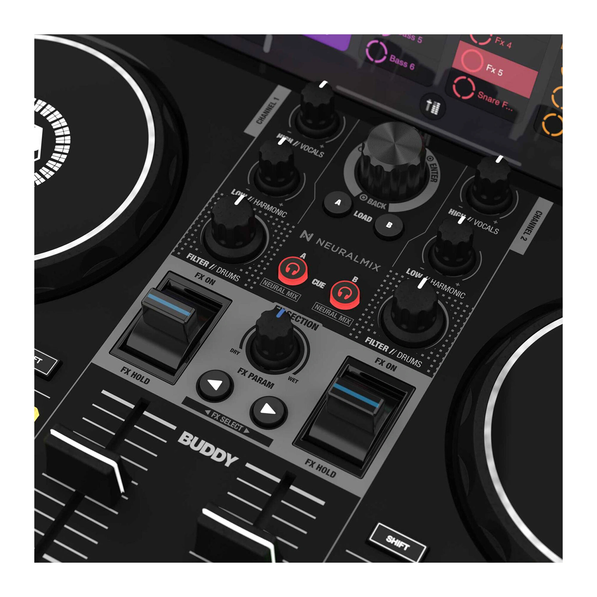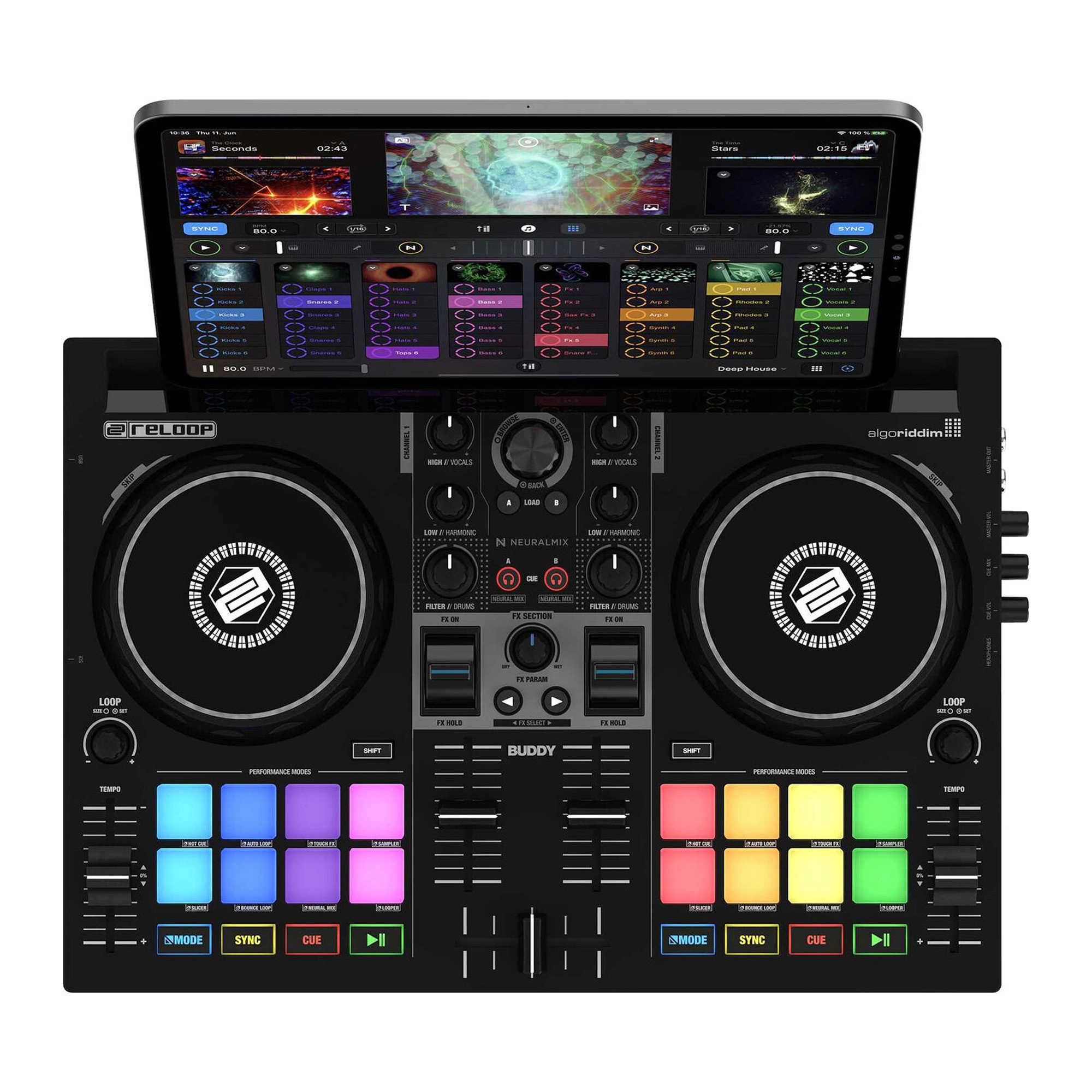 Buddy is a 2-channel controller specifically designed to work with the Algoriddim Djay app. The controller is suitable for learning DJing or situations where musicians need mobility.