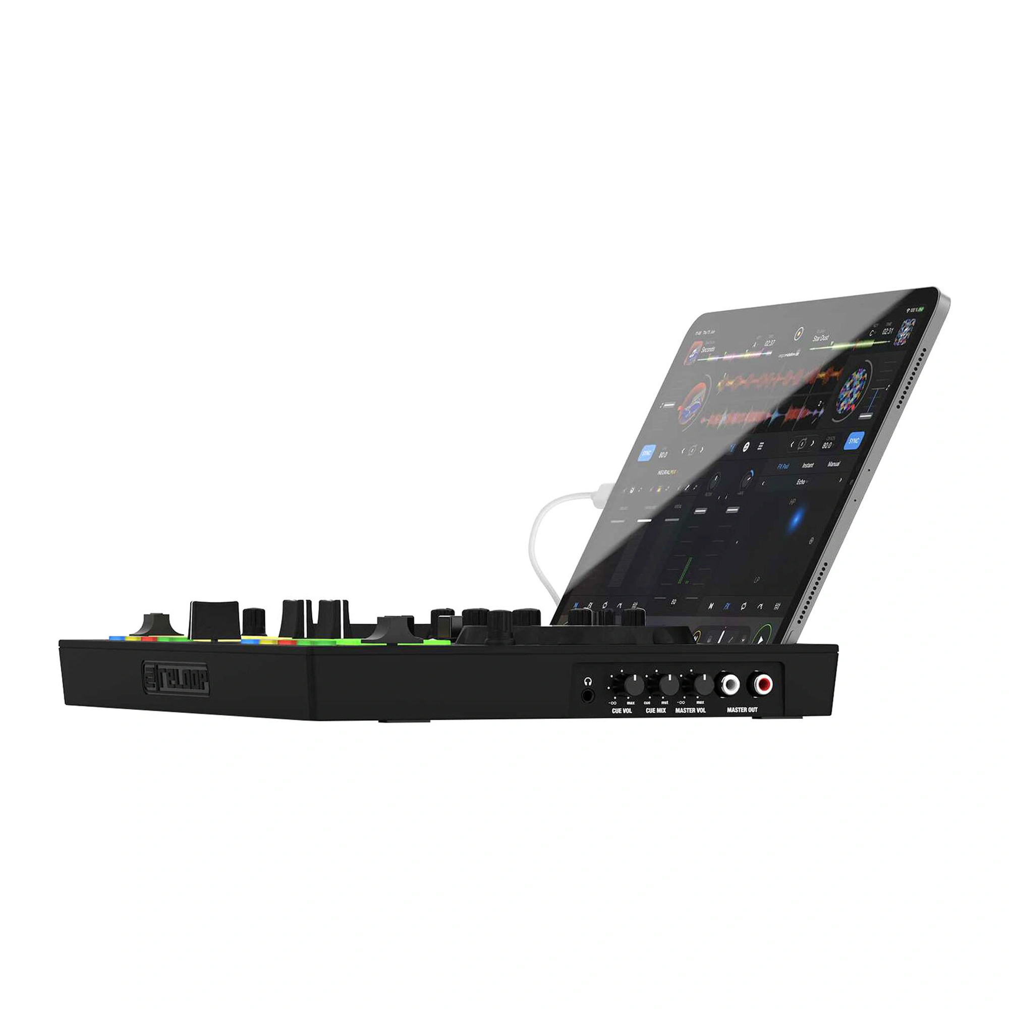 Since the controller has a USB port, it can be connected to a phone, tablet, or computer. There is a special slot on the body for mobile devices. Tracks can be loaded from your own libraries or streaming services - Tidal, Soundcloud Go+, Beatport Link, and Beatsource Link (subscription required). The controller connects to the sound system using RCA outputs.