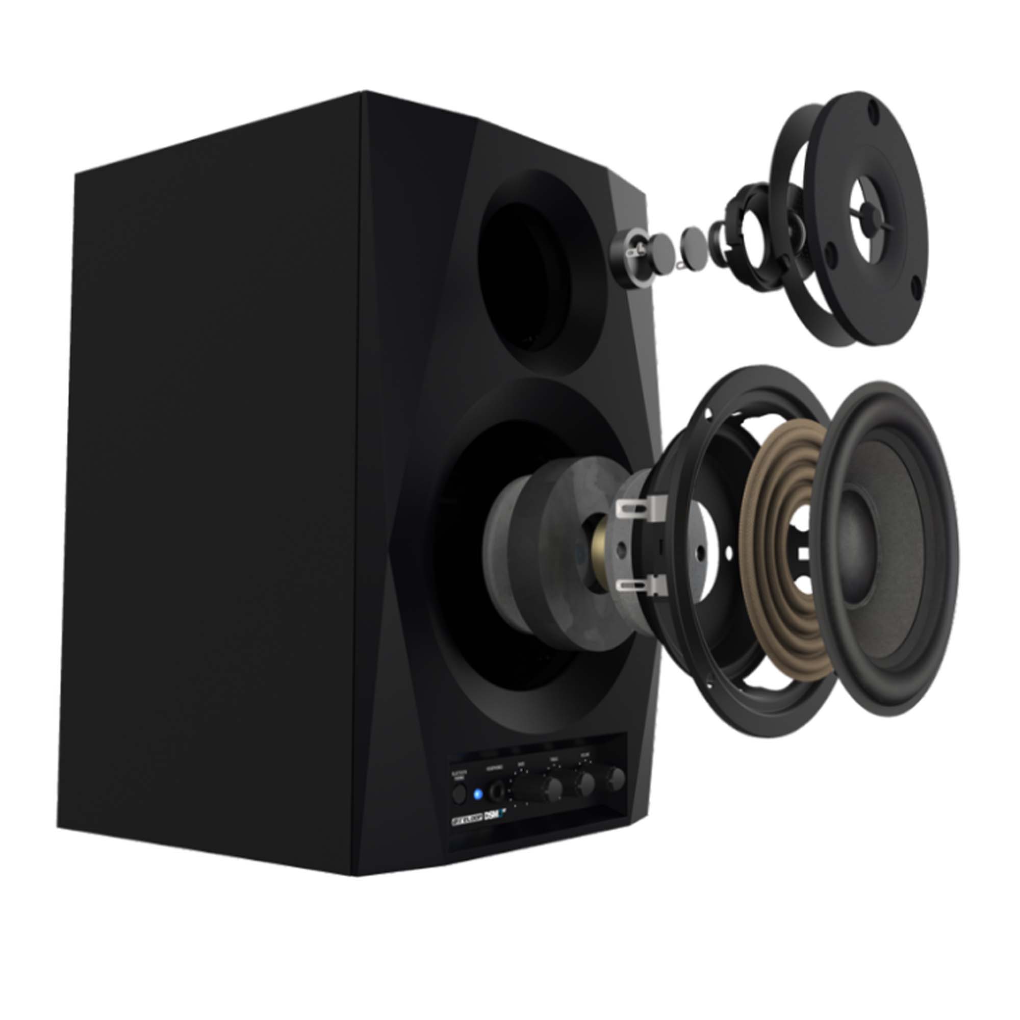 The bass reflex design enables powerful bass and reduced air resistance. The optimised tweeters also provide a broad stereo sweet spot for producers. Last but not least, the built-in class A/B amplifiers deliver a clear, low-distortion and rich sound.