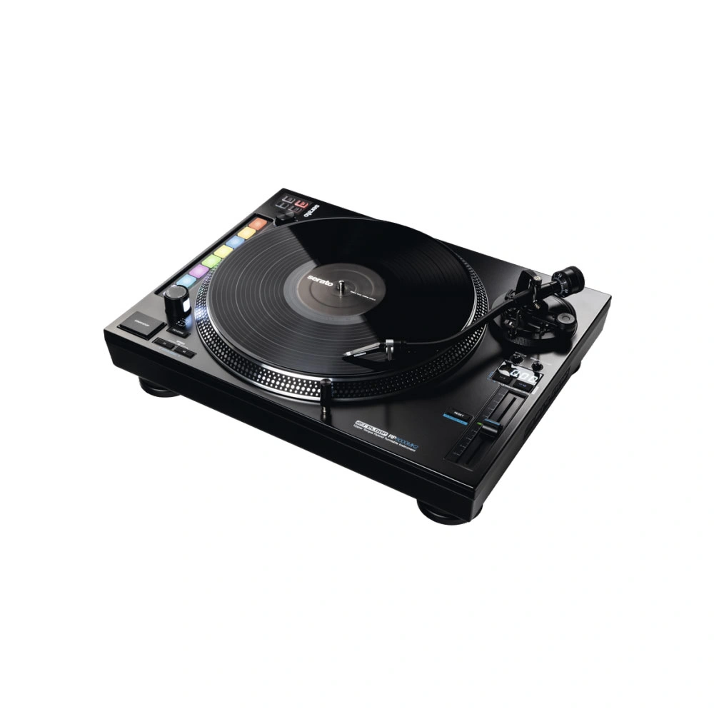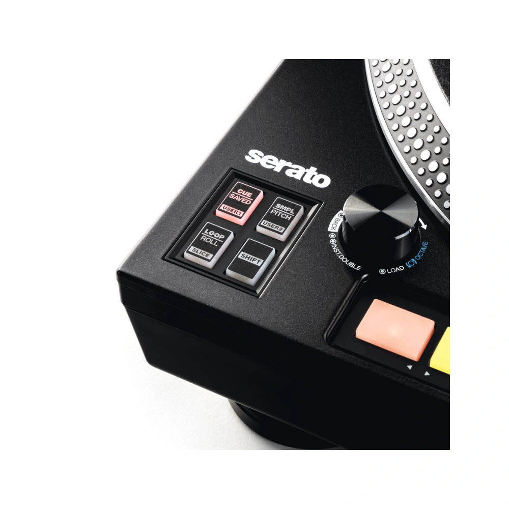 The main difference of this model from others in the series is the panel with seven pads with colored backlight. With these in Platter Play mode, you can control the pitch of the record by assigning notes using the built-in digital interface. Control is presented with four backlit buttons and an encoder. The values of the adjusted parameters are displayed on the LCD screen. A MIDI keyboard can be connected to the USB-A TT Link port and used instead of the pads.
