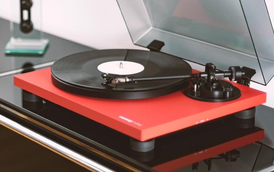 In addition to the power connection socket, the rear panel of the TURN 2 features two corrosion-resistant gold-plated RCA connectors and a separate grounding terminal to avoid ground loops. All connectors are removable, allowing for future upgrades or easy part replacement. The heavy MDF plinth edging features a strict design and is available in matte black, red, or white finishes. The high-inertia cast aluminum platter with chrome edging harmonizes with the turntable's sleek design.