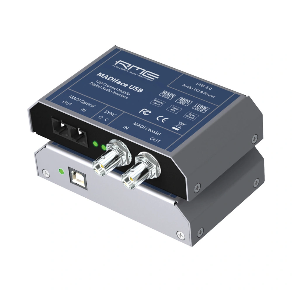 RME MADIface USB can also use MIDI-over-MADI technology for remote control of other devices via the MADI protocol. In standalone mode, the audio interface operates as a repeater, doubling the maximum cable length (100 meters for coaxial and 2 km for optical). It also serves as an active digital signal converter with jitter reduction. Power is supplied via the USB port.