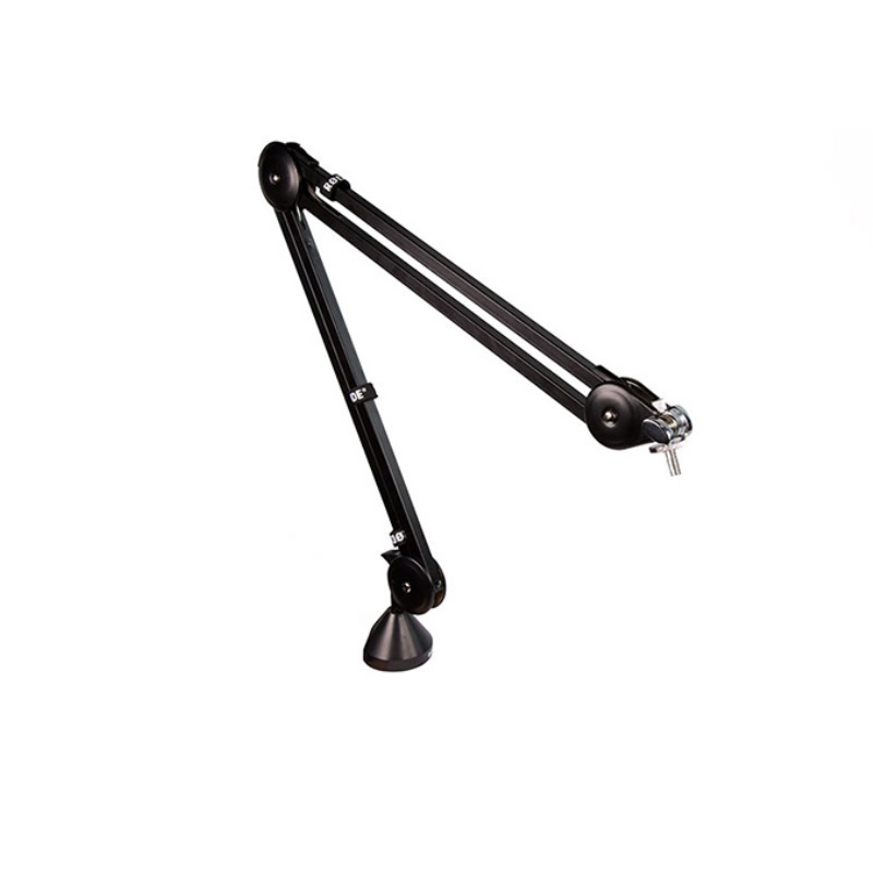 The PSA1 Desktop Mount "pantograph" is useful in the studio, on the radio, for broadcasting, and at home. It allows for a 360-degree rotation of a microphone weighing up to 2 kg. The PSA1 has a horizontal length of up to 820 mm and a vertical length of up to 840 mm, with both through-hole and clamp mounting options. It is suitable for surfaces with a thickness of up to 55 mm (clamp) and up to 70 mm (screw).