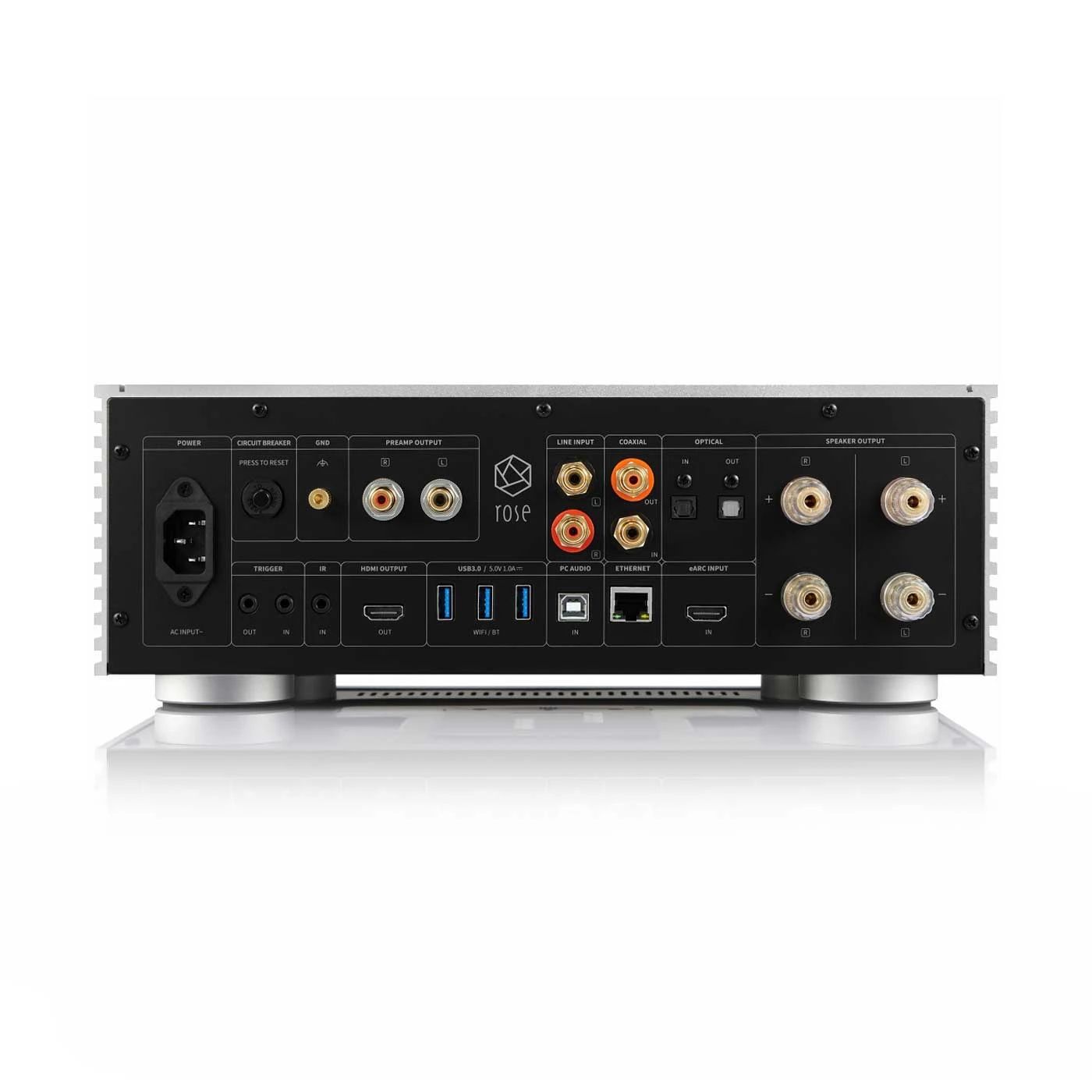 The elegant designer housing of the ROSE RS520 combines the main modules of two flagship devices: the RS150B streamer and the RA180 amplifier. The internet and network player is responsible for all possible connections of digital music (and video) sources, while the unique amplifier with the latest gallium nitride transistors provides power reserve and compatibility with a variety of speaker systems (250W per channel). The advanced amplifier scheme surpasses competitors by many years, and the digital network part is easily upgradeable through automatic updates. The functionality of the RS520 is constantly improving, growing, and keeping up with the latest trends in high-resolution digital music.
