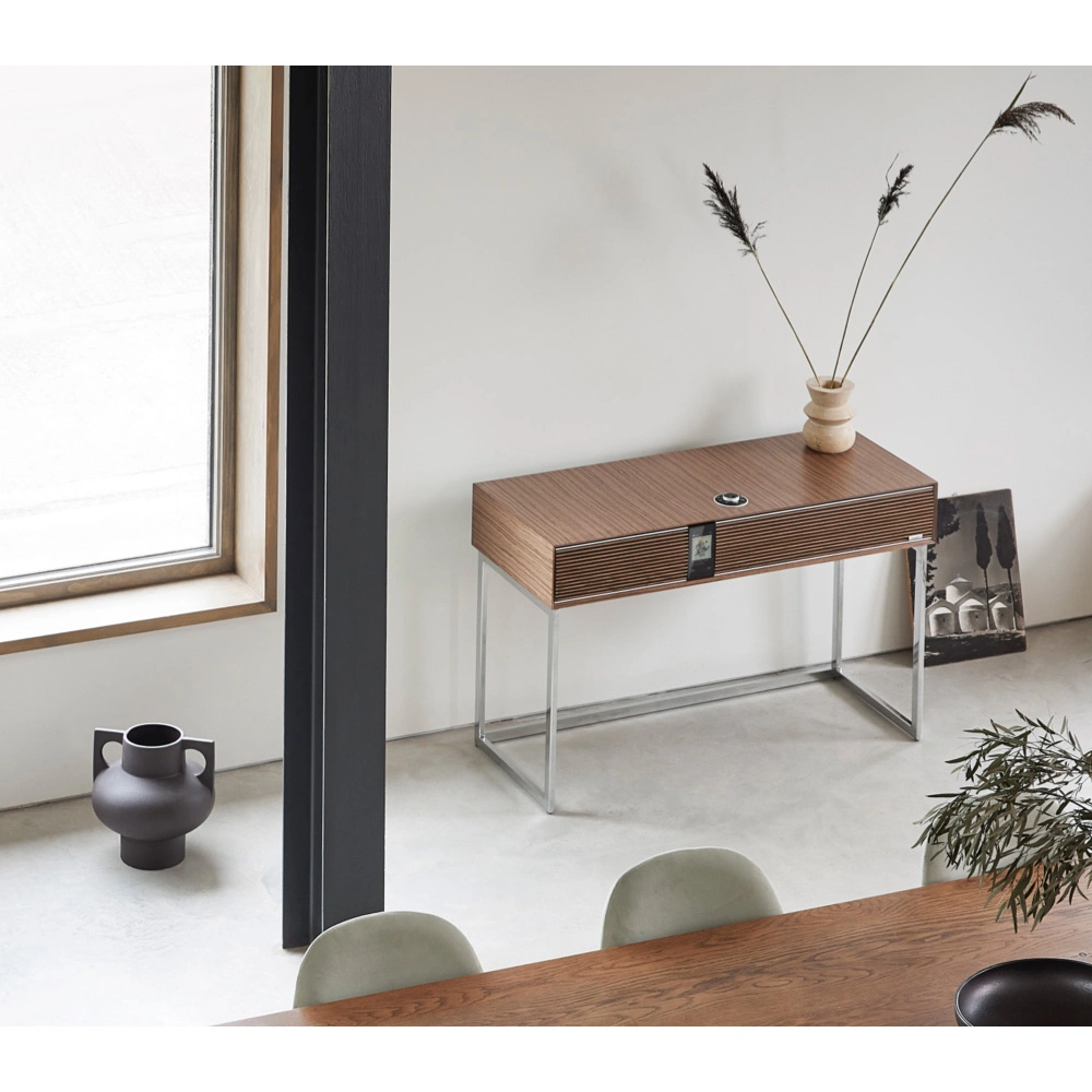 The Ruark Audio R810 is a stylish audio system designed with attention to detail and a modern take on seventies style. The cabinet is made from high-quality materials with natural wood, giving the system a luxurious look. Available in two finishes - walnut with a grain pattern resembling slow-growth hardwoods, and light grey lacquer - perfectly complemented by a polished chrome stand. Like the best furniture, this audio system is a piece that will enhance any space.