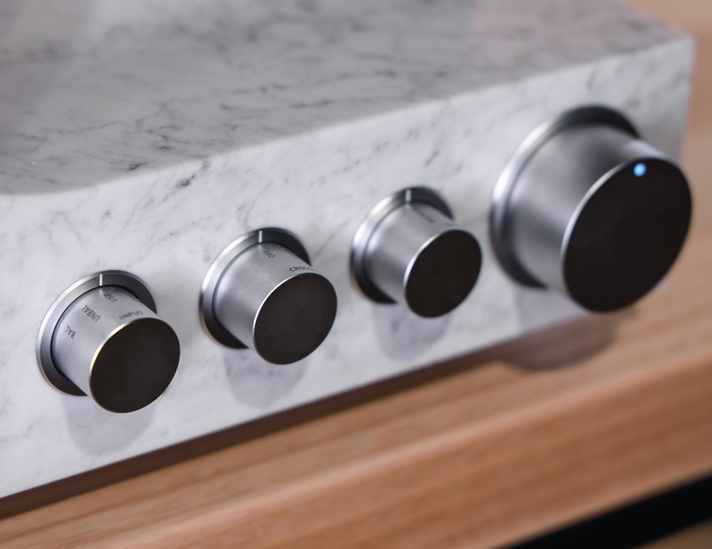 The striking design of the Sennheiser HE 1 combines form with functionality. The amplifier, suspended freely, is housed inside a glass body and a solid block of Carrara marble. This luxurious stone, extracted from the quarries of Carrara in Italy, was used by Michelangelo to create his famous sculptures during the Renaissance. Marble is not only beautiful but also reliably protects against contact noise. The power and volume control knobs are precision-machined from a solid piece of brass and chrome-plated. Music has become an art object.