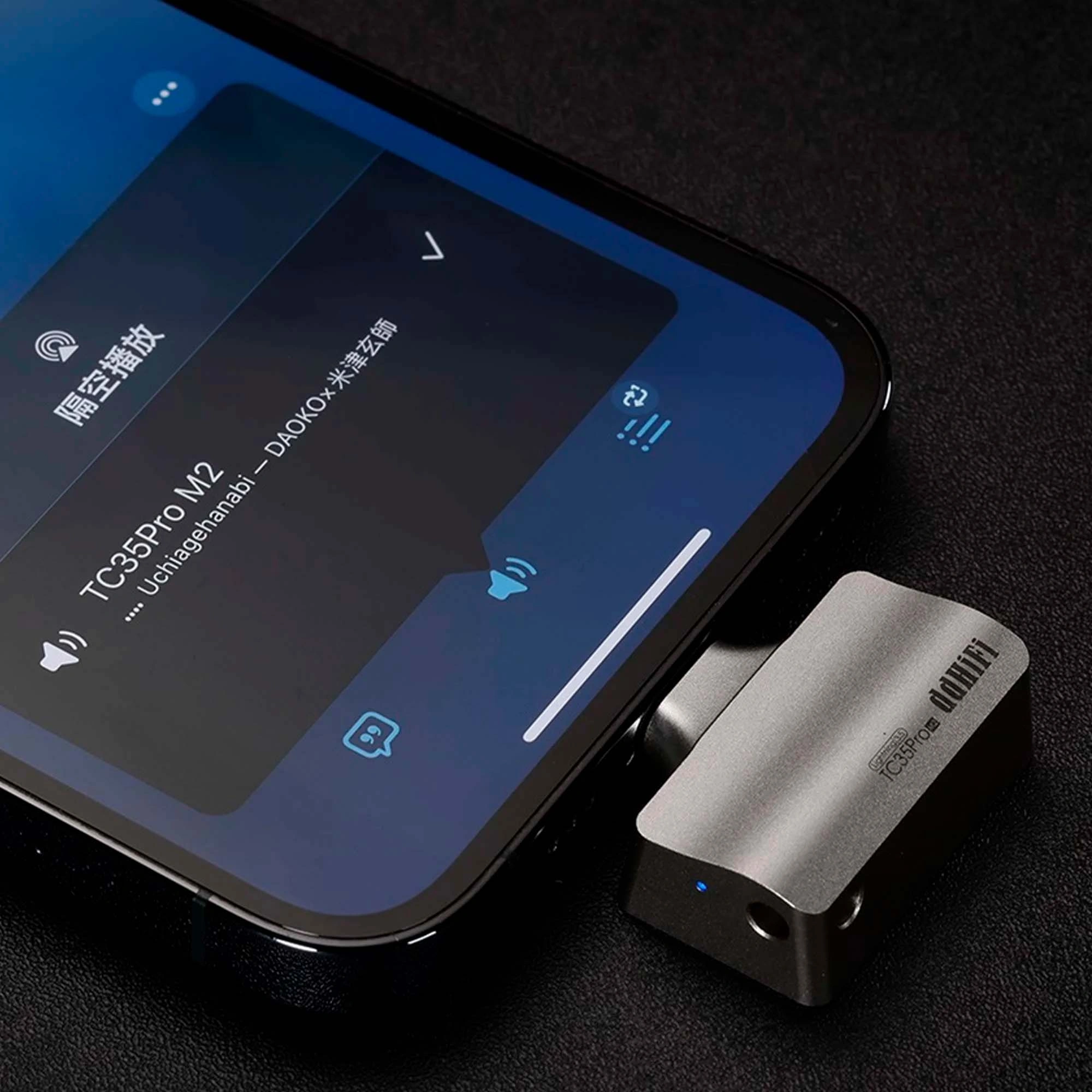 The portable digital-to-analog converter with a built-in headphone amplifier ddHiFi TC35C has an audio output for headphones and a Lightning USB input. It is suitable for connecting headphones with a 3.5mm jack to Lightning-supported devices. The power of ddHiFi TC35Pro M2 is 65 + 65 mW with 32-ohm headphones. It uses the CS43131 chip as the DAC and the ES9603Q as the amplifier.