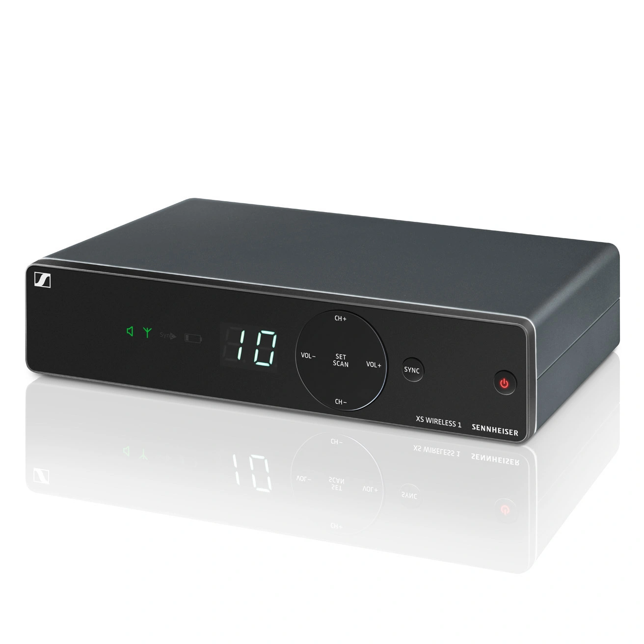 The wireless EM-XSW 1 receiver in the Sennheiser XSW 1-ME3-B kit features separate internal antennas and outputs for XLR and 1/4" TS Jack. It supports 10 channels and 8 banks. The front panel LED display shows the active channel number. The receiver has an automatic frequency management function, and can be easily synchronized through a remote channel. It is housed in a durable ABS plastic casing. The included universal power supply NT 12-5 CW works with voltages from 100-240 Volts.