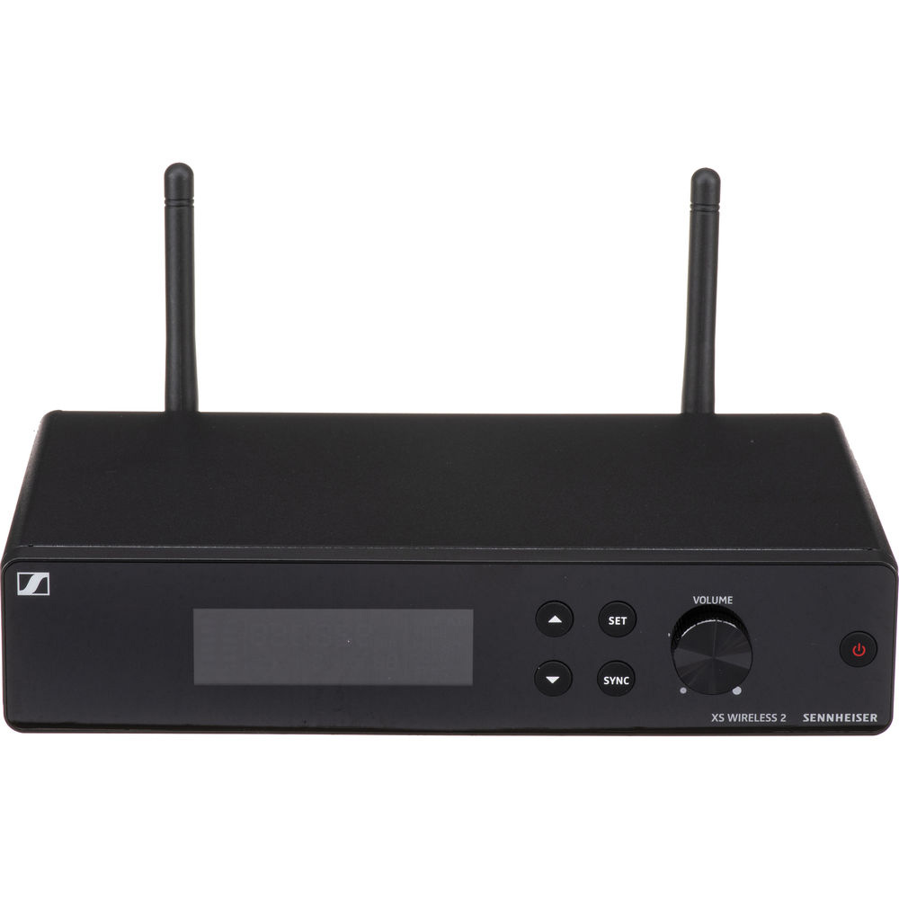 The EM-XSW 2 wireless receiver from the Sennheiser XSW 2-835-A set features two detachable external antennas and a metal housing. Outputs are available on a balanced XLR connector and an unbalanced 1/4" TS Jack connector. It supports 12 channels with 8 banks each. The front panel features a graphic LCD display that shows the active channel number, frequency, signal level, battery status, and auxiliary information. The housing also includes additional adjustment and synchronization buttons, as well as a large volume control knob. It has automatic frequency management function. The included NT 12-5 CW power supply is universal and works with voltages ranging from 100 to 240V.