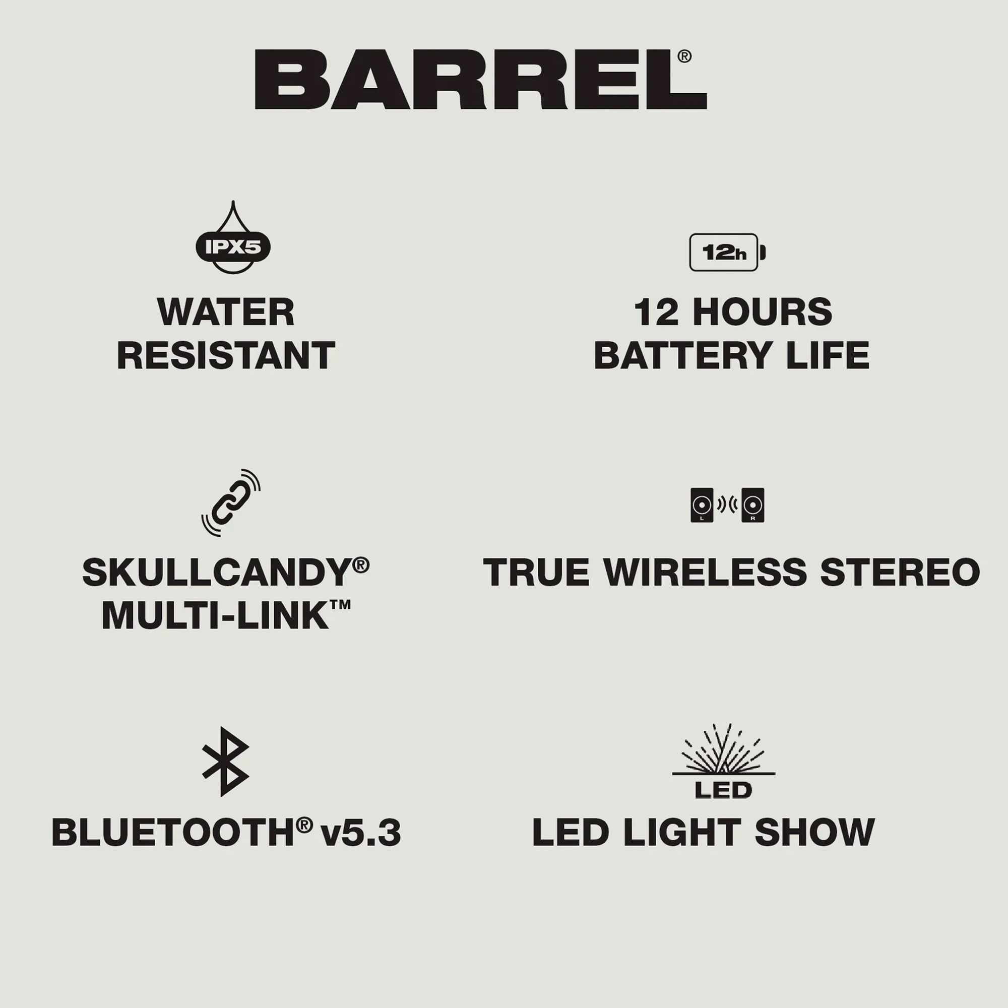 Skullcandy Barrel is a full-range wireless Bluetooth speaker that delivers bright high frequencies, rich midrange tones, and deep, punchy bass. It has everything you need to host your own home party, including a waterproof construction and an exciting LED light show. The Barrel also features a bass boost mode and music-synchronized LED lighting that brings your sound to life, creating an immersive audio-visual experience that transforms any space into your personal dance floor.