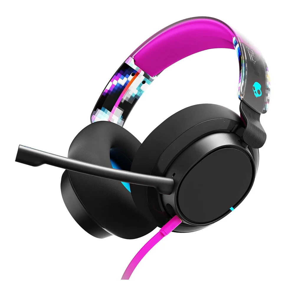 The wired gaming headset SLYR PRO by Skullcandy with microphone features a full-size construction, multi-platform connectivity, and stereo sound.