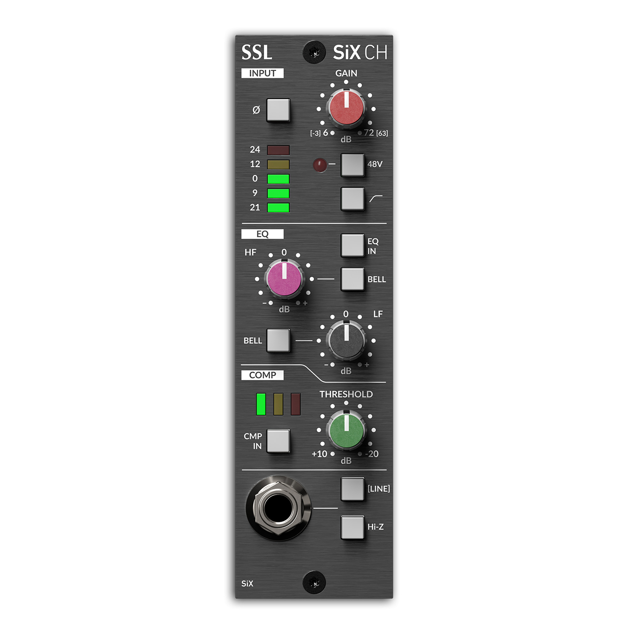 The SiX CH is a single-channel 500 series strip utilizing the SuperAnalogueTM channel processing features found on the SSL SiX console, including microphone input, low and high frequency equalization, and a one-knob compressor.