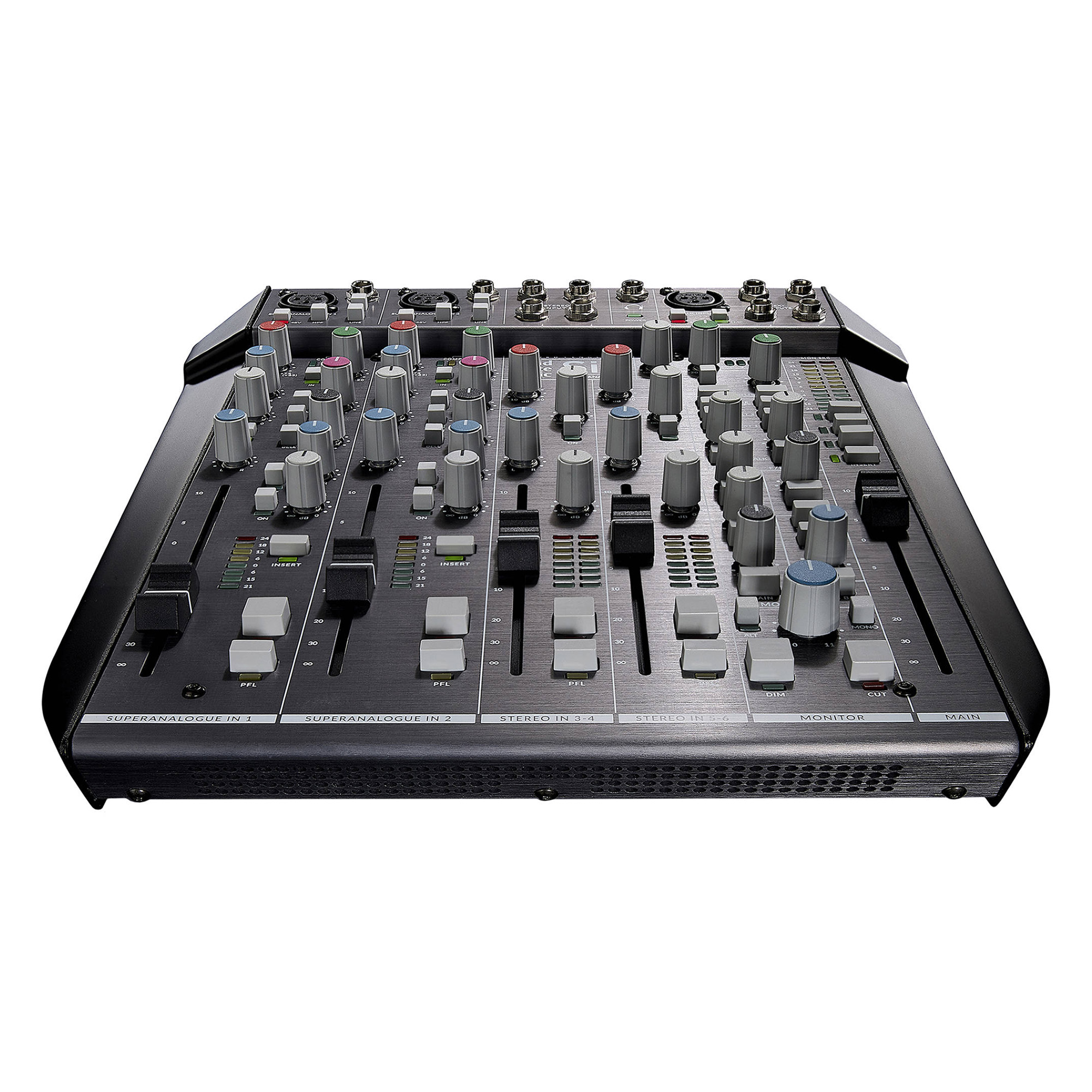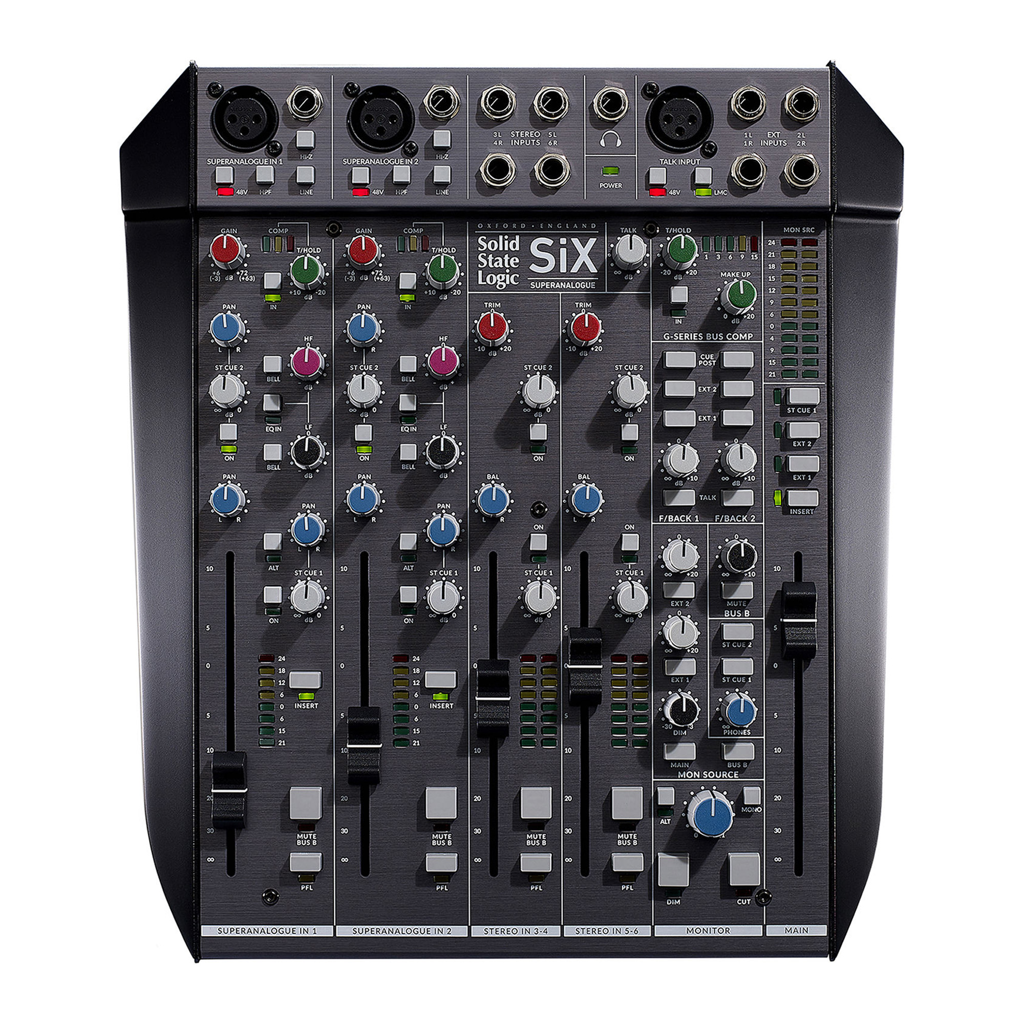 The SiX is a compact professional console suitable for use in the studio, in post-production, on stage, and for podcasting. Offering the big console sound and an impressive set of utility features in a small enough format to fit in a bag and take anywhere. The SiX provides two recording channels with SuperAnalogue™ microphone preamp, a version of the classic SSL Channel Compressor with one knob, a new two-band EQ, and 100mm faders.