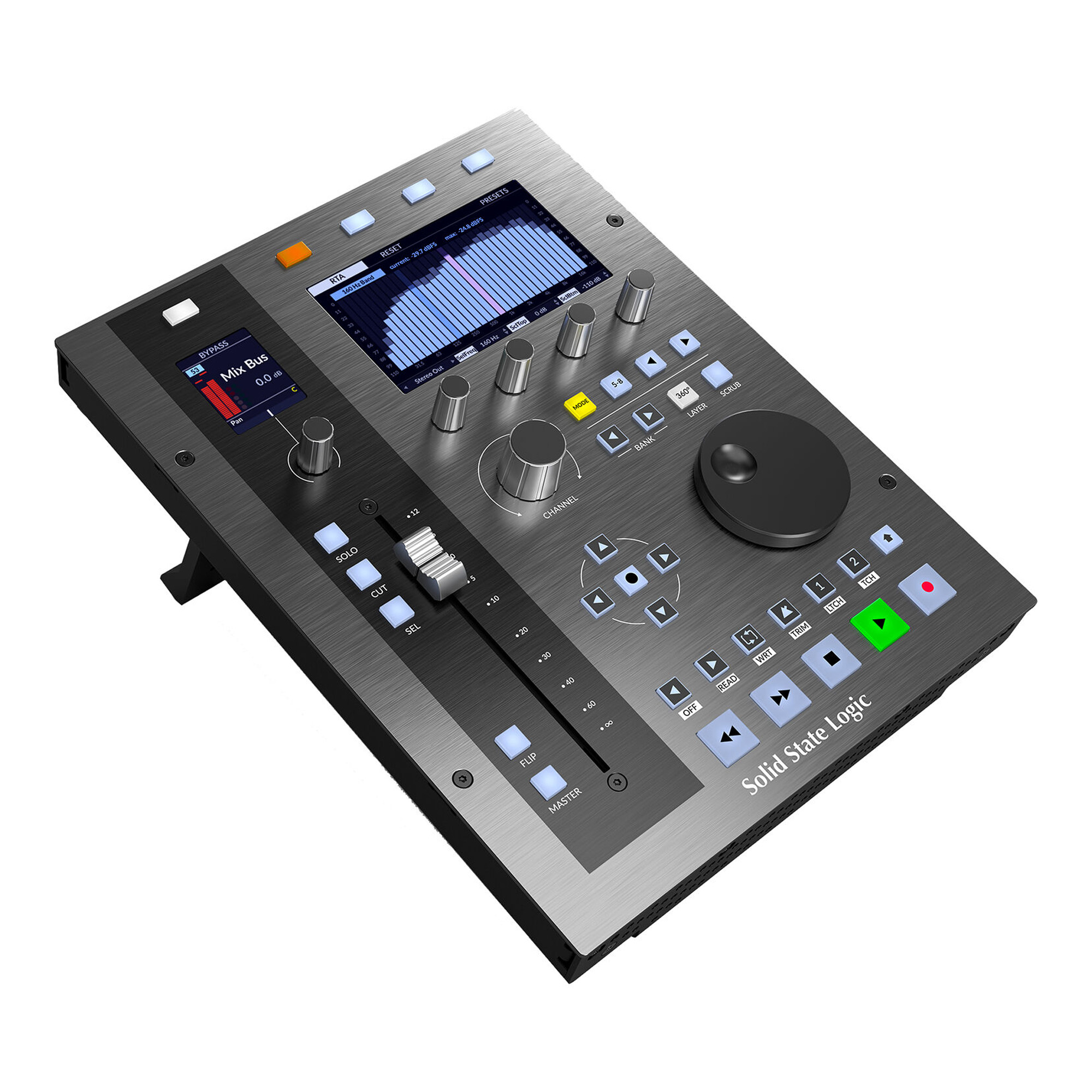In addition to comprehensive DAW control, each UF1 purchase includes a perpetual license for the SSL Meter plugin module, displayed on a large 4.3-inch IPS screen and controllable directly from the UF1 surface or SSL 360° mixer. The SSL Meter plugin offers essential measurement tools including peak and RMS levels, K-system, stereo balance, phase correlation meter, Lissajous phase scope, 31-band RTA, VU, and PPM measurement.