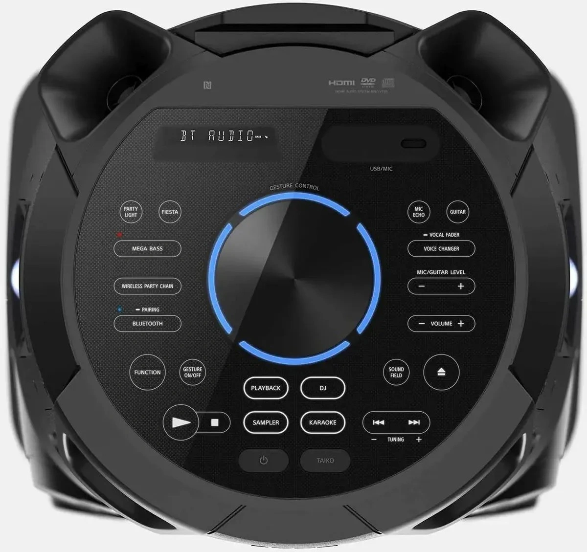 Switch tracks, activate the flanger or "wah-wah" effect, increase the microphone volume for karaoke, adjust the pitch of the microphone and music, and control the volume with a vertical or horizontal hand swing. The MHC-V73D can be operated with gestures, without distracting from the fun.