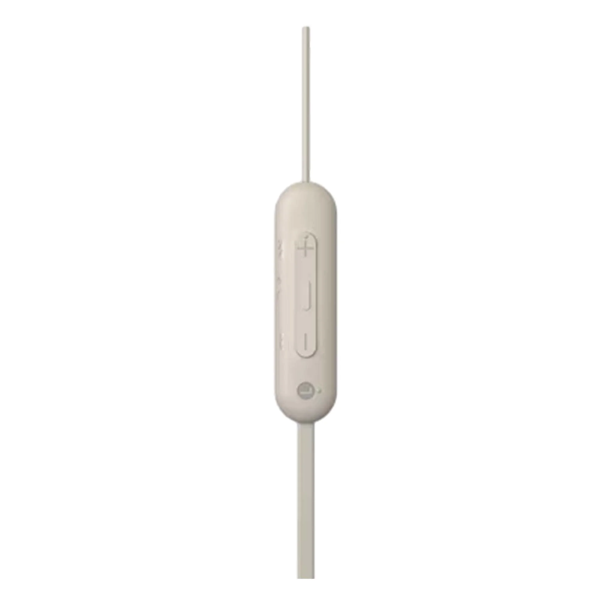The WI-C100 earphones are easy to operate, with buttons for play/pause, track skipping, volume adjustment, and call answering. The buttons have been redesigned for convenience and clearer feedback when pressed.