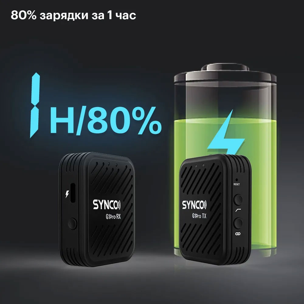 The professional digital wireless microphone system SYNCO G1(A1)PRO operates at a frequency of 2.4 GHz. Seamless operation up to 200 meters away, wireless charging case, encoded signal transmission, low-frequency filter, signal gain adjustment, and long autonomous operation make it an ideal choice for recording sound during performances, interviews, live broadcasts, filming educational programs, and videos.