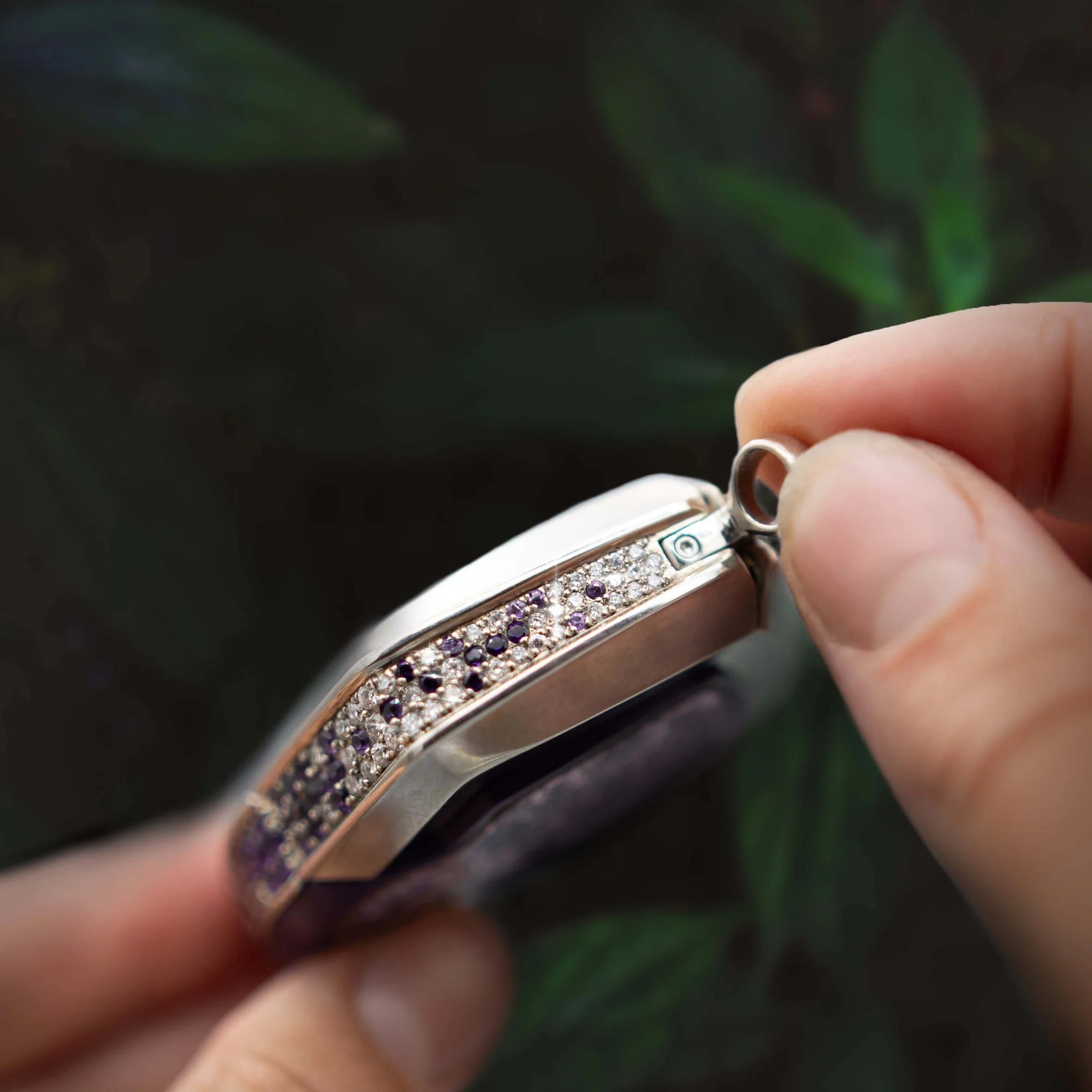 The Fleur de Glace Violette makes a statement that is beyond stunning. Regal purple Cerakote over YTPZ ceramic sets atop nearly 3 ounces of solid white 10k gold and features 287 real diamonds and amethysts totaling just over 6 carats. The cover inserts were designed by our own in-house art director Rachel Kersten featuring a bold floral pattern of peonies painted onto luxurious metallic pig-suede cover inserts.