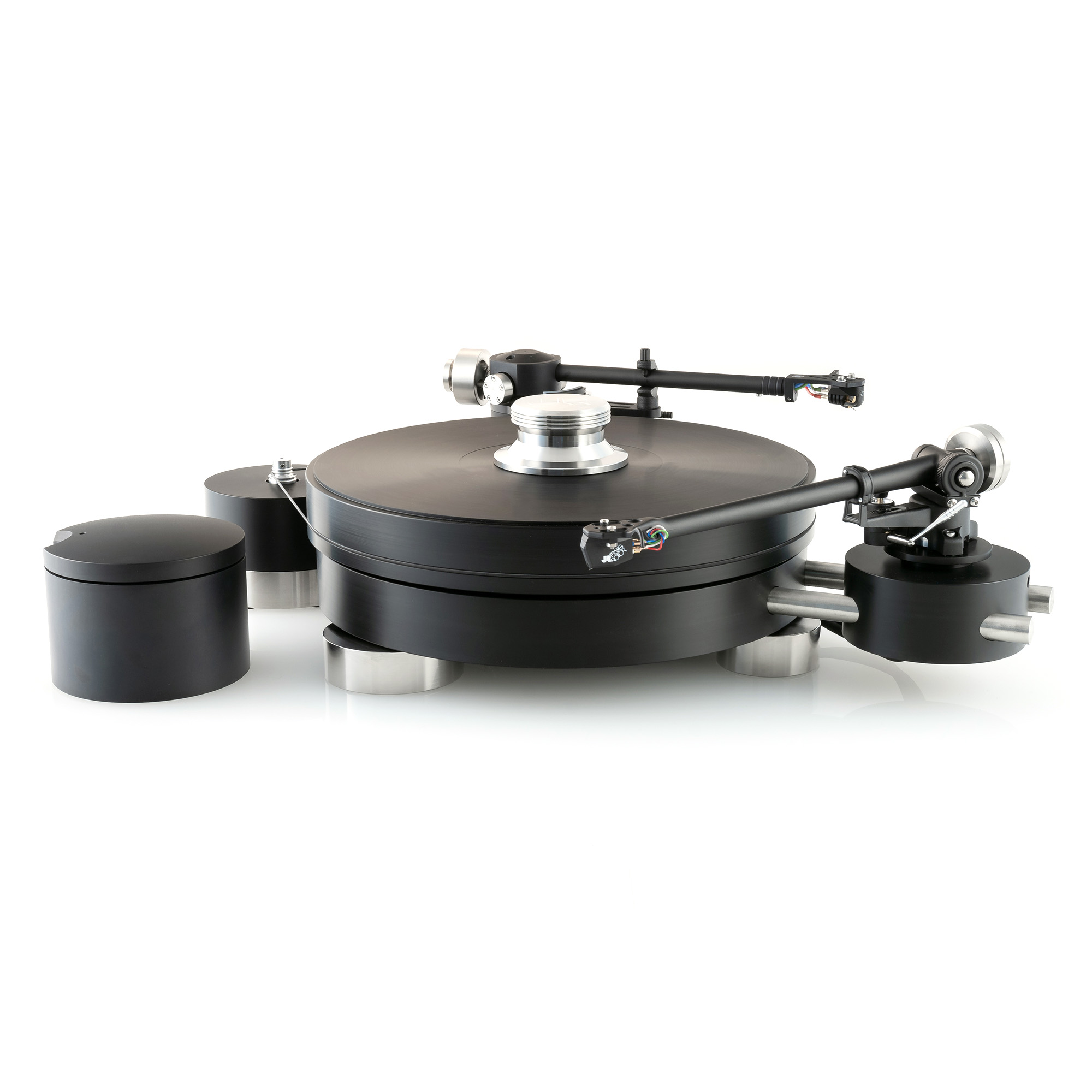 The turntable allows for the installation of two tonearms (including two 12-inch tonearms) and choosing a base for each. The turntable uses a round thermoplastic base slightly smaller in diameter than the main disc. The base sits on three adjustable aluminum feet. The assembly is made of aluminum with a drilled center and a silicone support ring on the outer edge. Standard adjustment is done by threads.