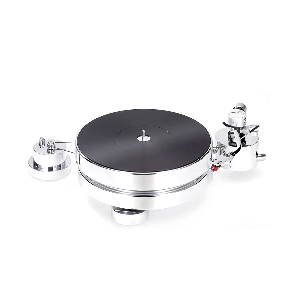 The device allows for the installation of two tonearms (including two 12-inch tonearms) and choose a base for each. A round base made of polished aluminum slightly smaller in diameter than the main platter is used as the turntable. The base rests on three adjustable aluminum feet. The alignment construction consists of an aluminum part with a drilled center and a silicone support ring on the outer edge. The standard adjustment is done by thread.