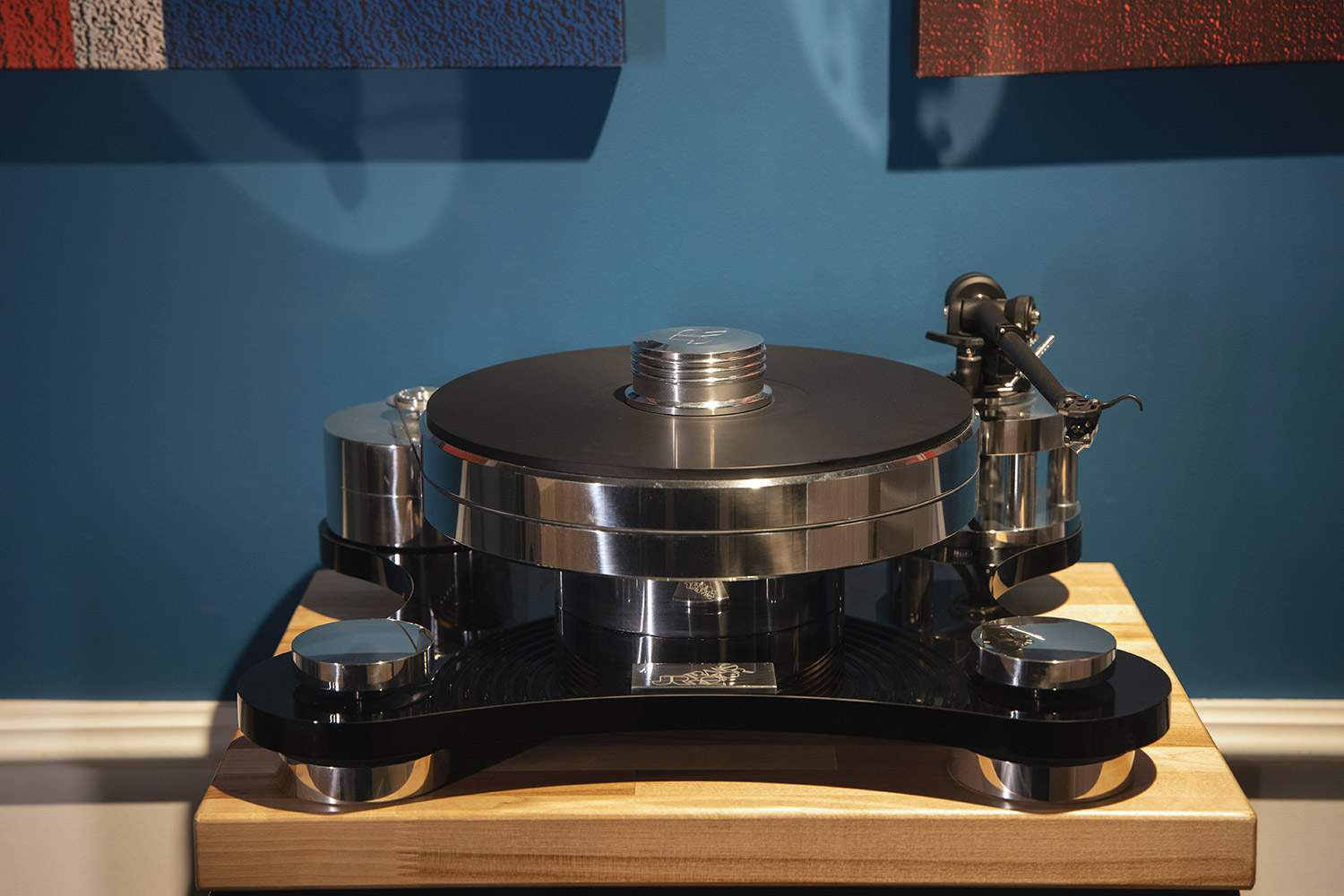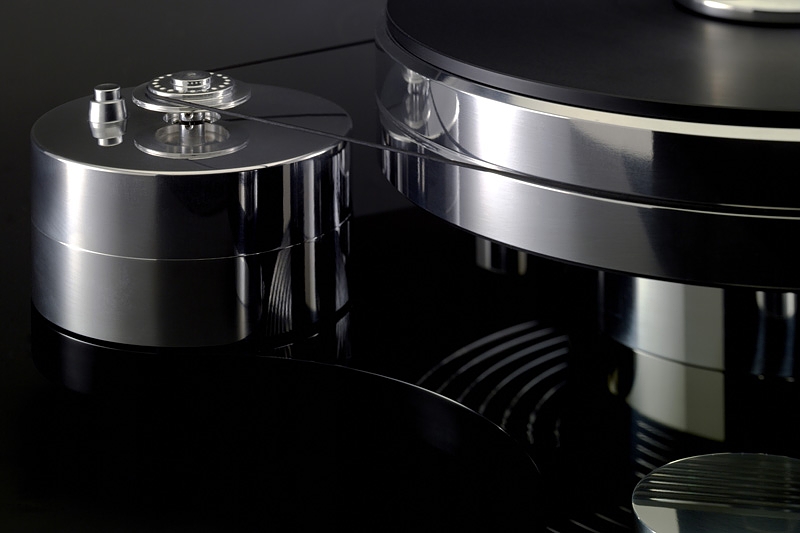 All other components of the turntable are attached or installed on the acrylic base. The massive aluminum bearing housing with concentric "waves" holds a significant bronze insert cup, while the steel bearing pulley is connected to an aluminum sub-platter. The bearing is not inverted and operates with liquid lubrication.