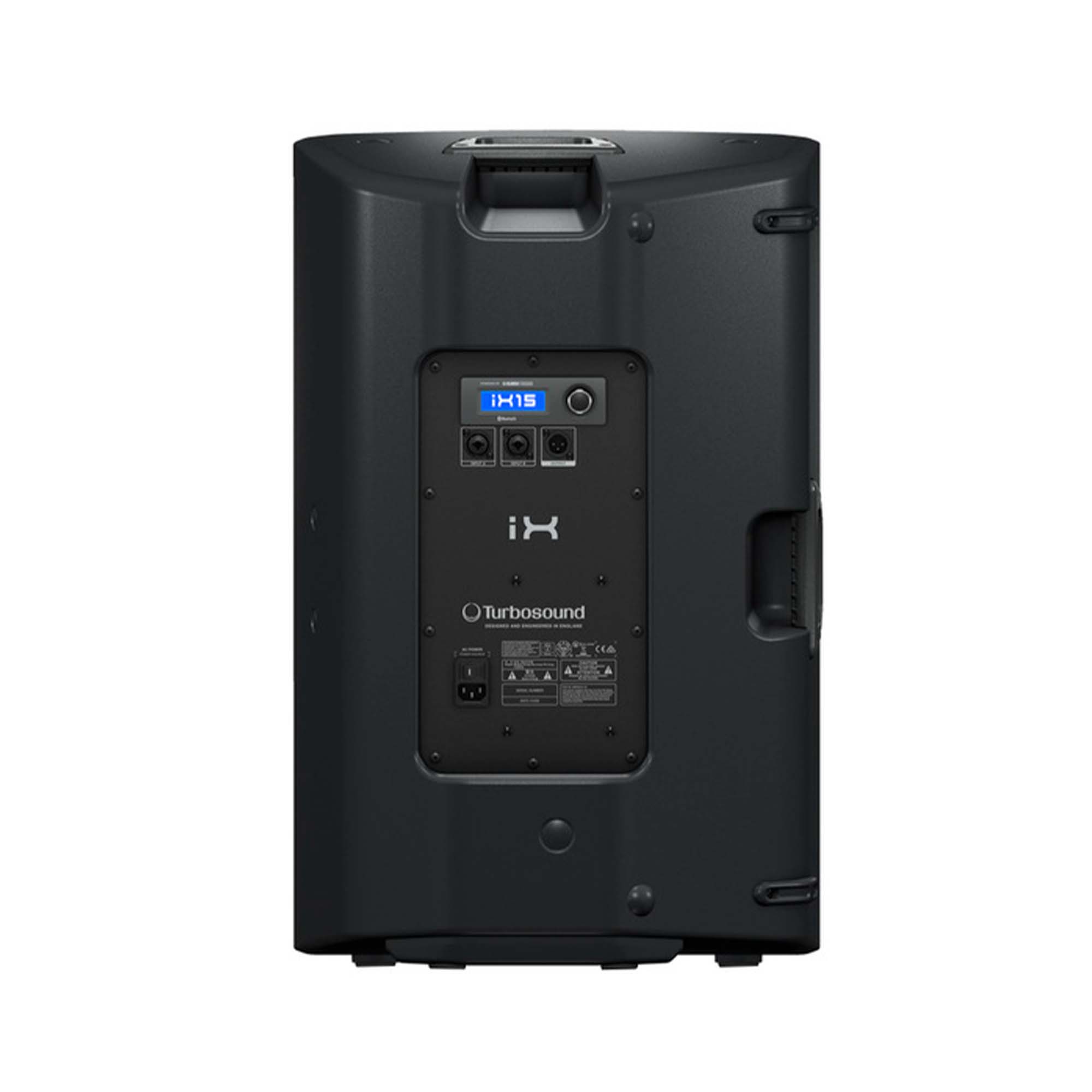The rear panel of the Turbosound iX15 features two main balanced combo inputs on TRS/XLR, with the input level adjustment of each controlled by a master knob. There is also an XLR-M output for sending a copy of the source signal to another speaker using a standard XLR cable. This allows for building multi-channel systems with iX series speakers. The universal push-button handle next to a large monochrome LCD display allows users to control sound levels, adjust equalizer settings, and activate frequency response presets or location-based settings.