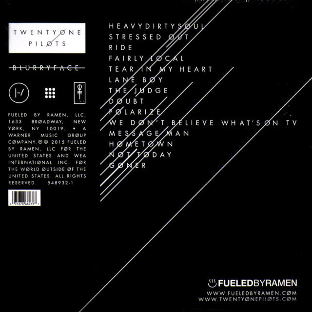 Blurryface is the fourth studio album by American rock band Twenty One Pilots, released on double vinyl in 2015. It is their second full-length album, released through Fueled by Ramen after signing with Atlantic Records. The album sold over 134,000 copies in its first week, debuting at number one on the Billboard 200 chart.